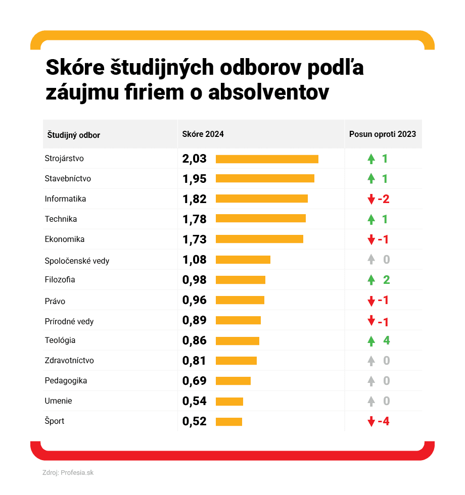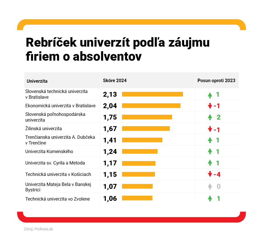 Najatraktívnejších absolventov a absolventky má Slovenská technická univerzita v Bratislave, ktorá sa na čelo rebríčka vrátila po dvoch rokoch. Ekonomická univerzita v Bratislave má druhých najžiadanejších absolventov a z piateho na tretie miesto sa dostala Slovenská poľnohospodárska univerzita. Tá už rok predtým stúpla o 3 priečky vyššie, čiže dopyt po jej absolventkách a absolventoch výrazne rastie.
