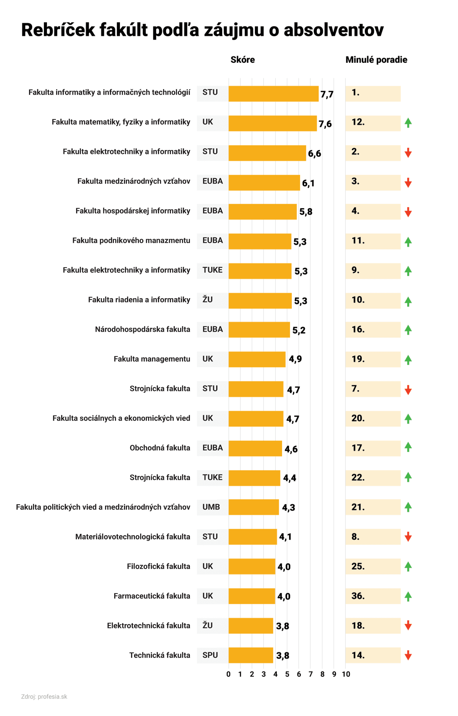 Firma Profesia zostavila rebríček verejných vysokých škôl a fakúlt už po 13. raz. Každoročná analýza mapuje úspech absolventov na trhu práce počas predošlého roka. Umiestnenie závisí od toho, koľko zamestnávateľov si prehliada životopisy absolventov, ktoré boli uverejnené na pracovnom portáli Profesia.sk. Rebríček tak nehodnotí úroveň vyučovania, ale zameriava sa na uplatnenie jednotlivých absolventov na trhu práce.