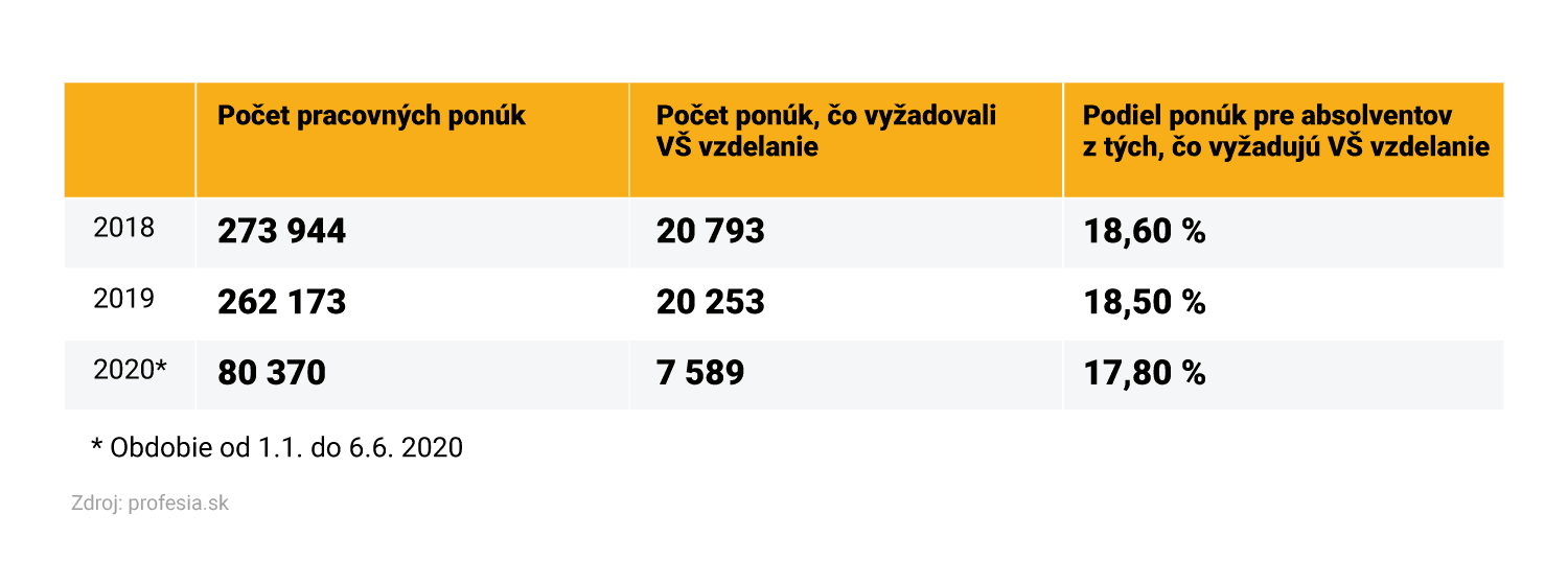 Portál Profesia.sk počas posledných rokov informoval o zvyšovaní podielu ponúk, ktoré sú vhodné pre absolventov. Dôvodom bol najmä výrazne vyšší počet ponúk a náročná situácia u zamestnávateľov, ktorí sa pri hľadaní novej pracovnej sily často trápili. Zmena situácie nastala čiastočne už vlani. Výraznejšia recesia však bola očakávaná až na rok 2020. Tá prišla vďaka pandémii omnoho skôr a taktiež v omnoho väčšej sile, ako sa predpokladalo.