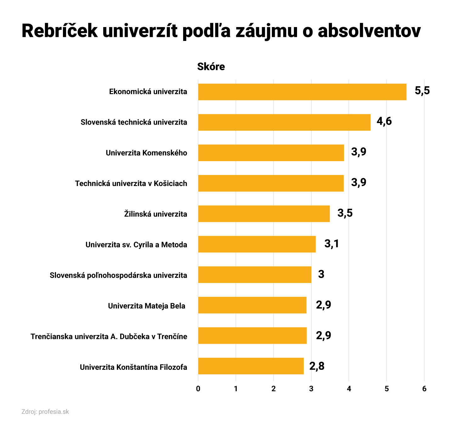 Spomedzi slovenských verejných vysokých škôl bol vlani na Profesia.sk najväčší záujem o absolventov Ekonomickej univerzity. Za ňou skončili ďalšie dve bratislavské školy – Slovenská technická univerzita a Univerzita Komenského.