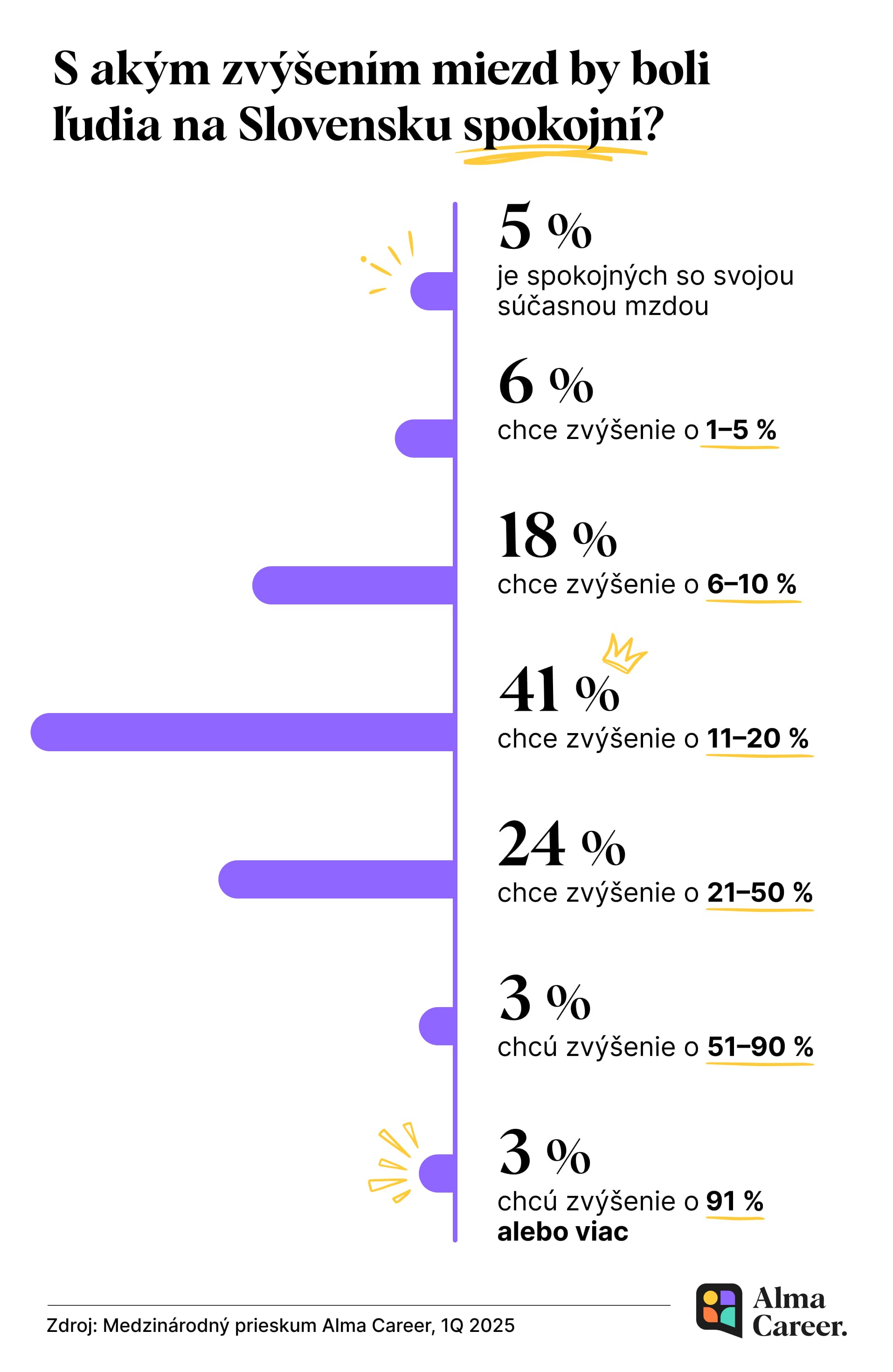 Prieskum zisťoval aj predstavu zamestnancov o tom, aké zvýšenie mzdy by považovali za dostatočné, aby boli so svojím finančným ohodnotením spokojní. Spokojnosť s aktuálnym platom deklarovalo len 5 % respondentov, ďalších 5 % by uspokojil nárast do 5 % a 17 % by postačilo zvýšenie o 6 až 10 %. Najväčšia skupina (40 %) by uvítala zvýšenie v rozmedzí 11–20 %. Zvyšných 33 % uviedlo rast o viac než 21 %.