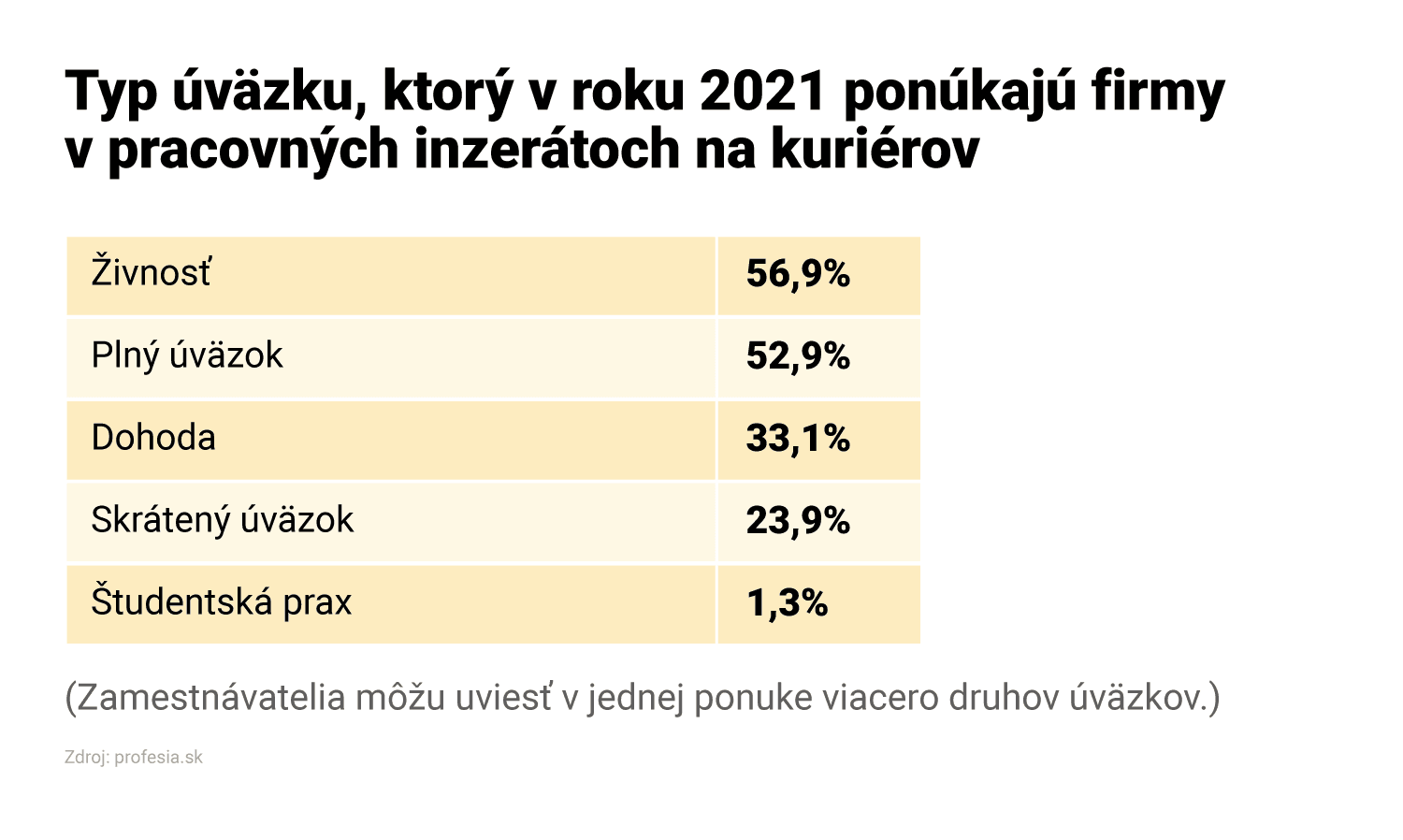 Kto chce robiť kuriéra, musí si v mnohých prípadoch založiť živnosť. Najväčšia časť pracovných ponúk na túto pozíciu ponúka práve takýto druh kontraktu. Plný úväzok je až na druhom mieste.