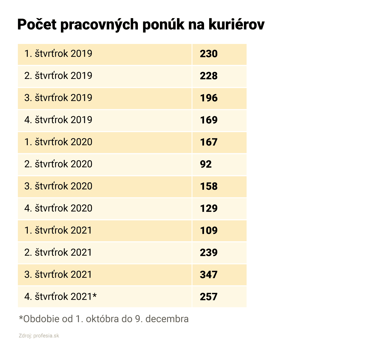 Porovnanie aktuálnych čísel s predošlými obdobiami ukazuje, že rok 2021 priniesol kuriérom rekordné čísla. Zamestnávatelia uverejnili v treťom štvrťroku 347 pracovných inzerátov na túto pozíciu. Je to najvyššie číslo v histórií najväčšieho pracovného portálu na Slovensku.