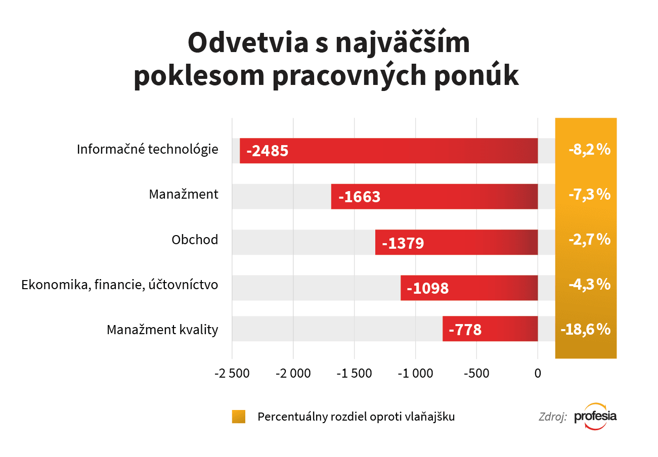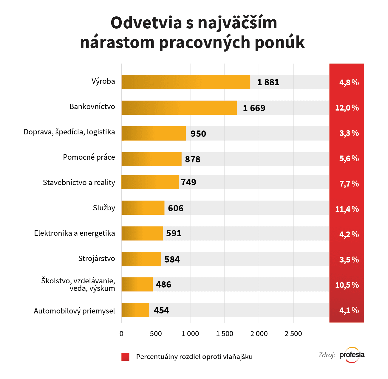 Hoci celkový počet ponúk medziročne klesol, rovnaký osud nepostihol všetky odvetvia. Medzi sektormi, ktoré zaznamenali nárast, sa darilo najmä výrobe a bankovníctvu.