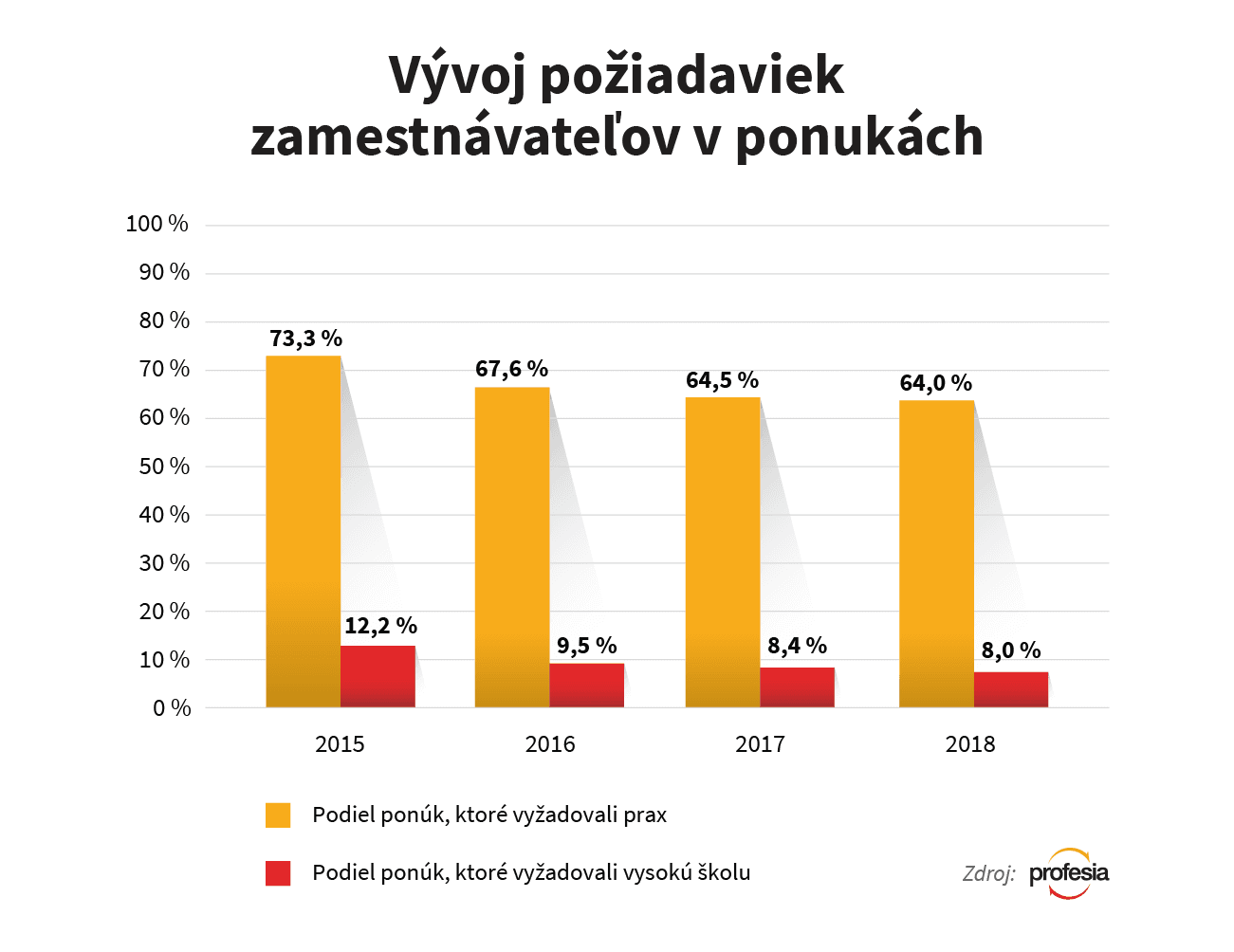 Zrejme to je jeden z dôvodov, prečo firmy znižujú v pracovných inzerátoch svoje nároky. Vidieť to napríklad na podiele ponúk, ktoré vyžadujú prax. V roku 2015 išlo o približne 73 percent ponúk. V roku 2018 to už bolo 64 percent.