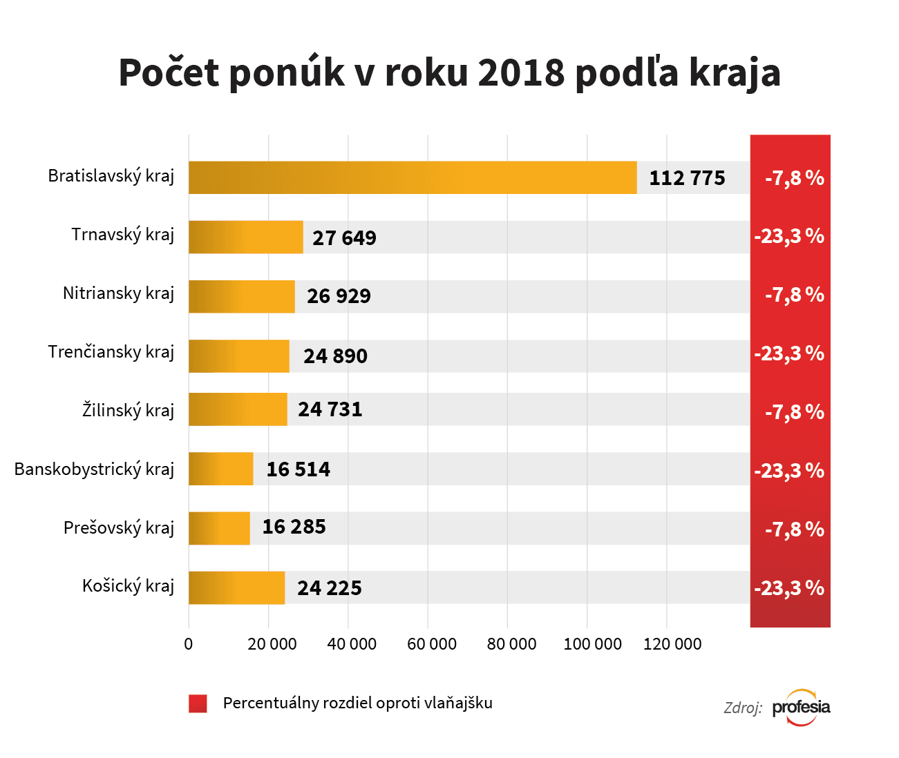 Pokles oproti roku 2017 vidieť v každom regióne na Slovensku. V absolútnych číslach bol rozdiel najväčší v Bratislavskom kraji, kde bolo medziročne o 9 488 ponúk menej. Na druhom mieste bol Trnavský kraj, kde počet ponúk klesol o 8 379.