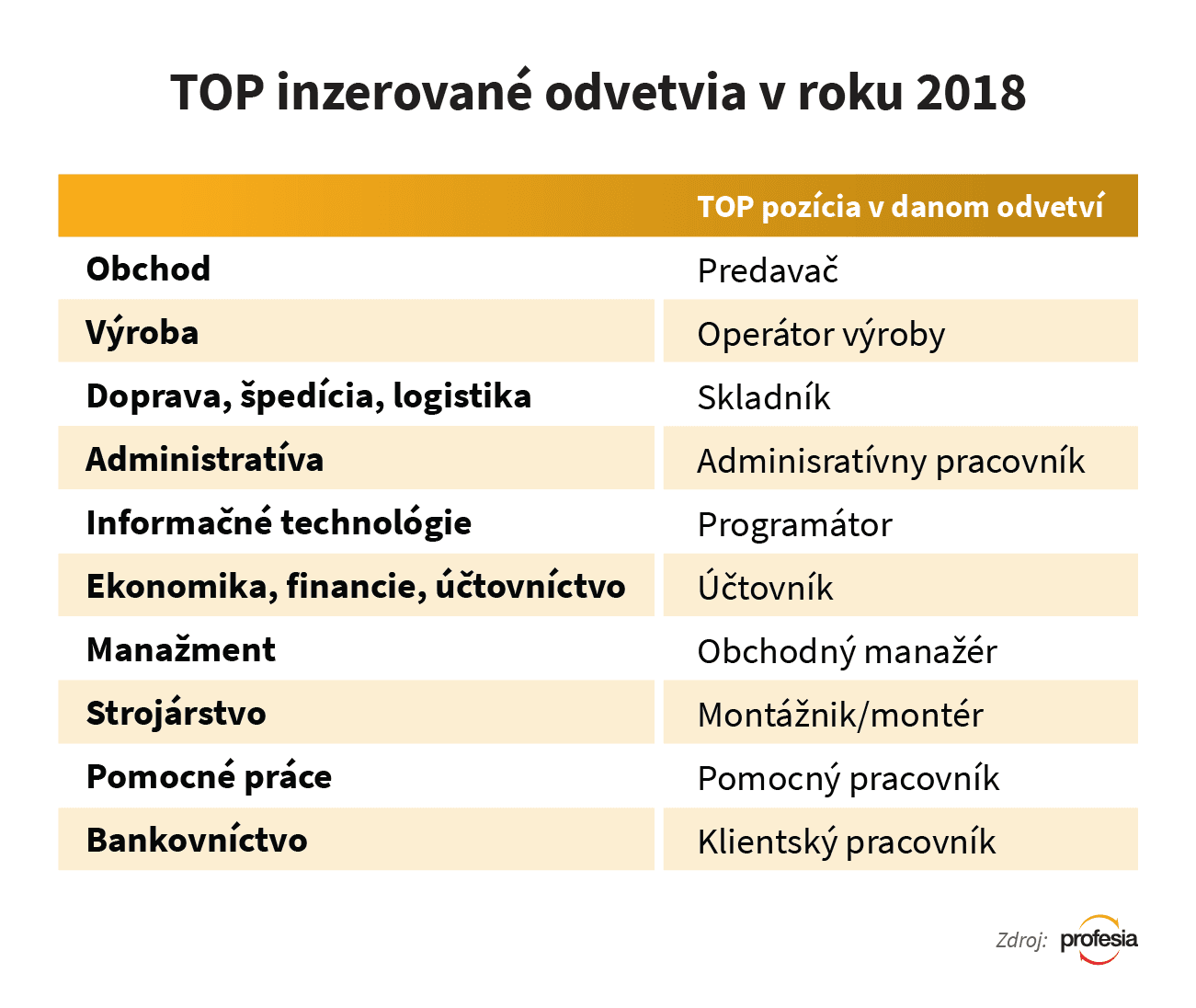 Odvetviami, do ktorých sa v roku 2018 hľadalo najviac nových zamestnancov, boli najmä obchod, výroba a doprava, špedícia, logistika.