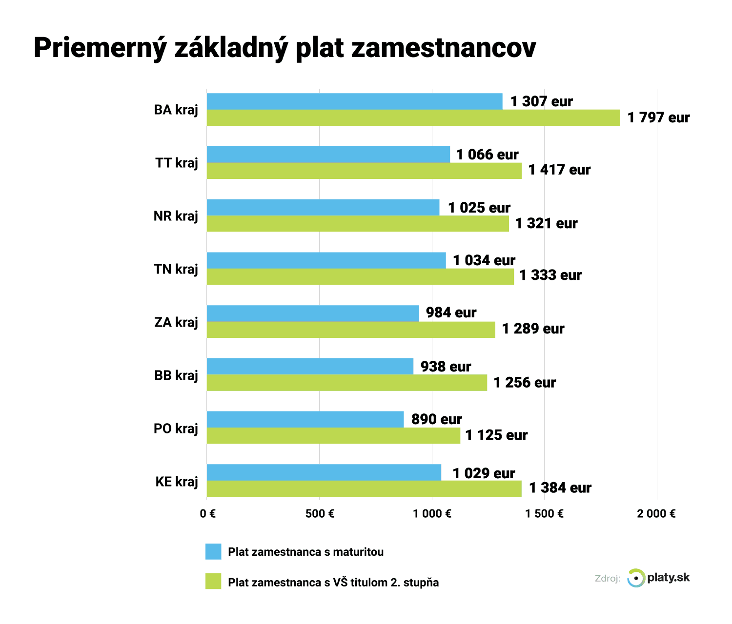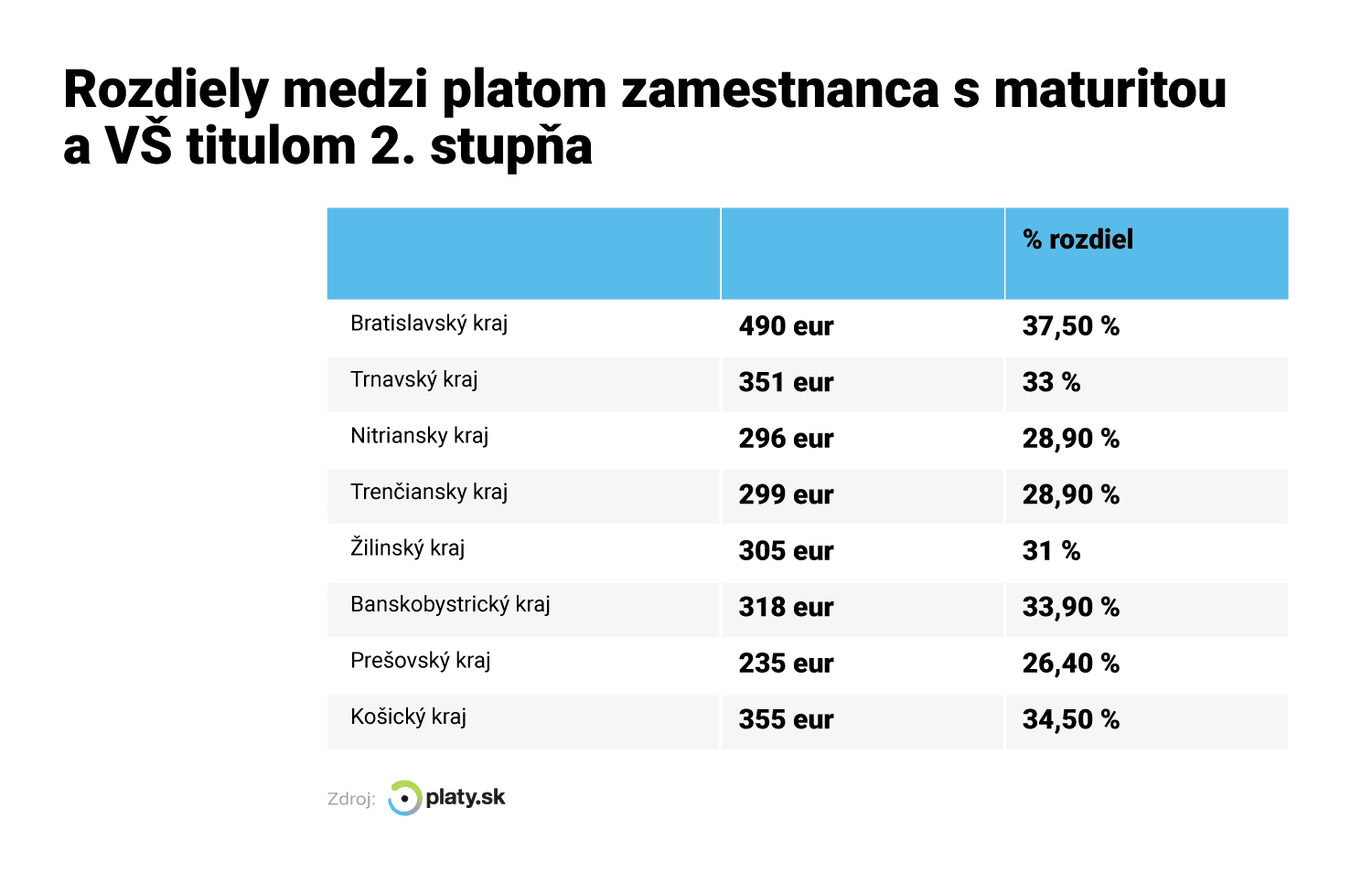 Naopak, ak sa pozrieme na to, kde je rozdiel medzi platmi najnižší, je to Prešovský kraj. Rozdiel medzi zamestnancom s maturitou a zamestnancom s vysokou školou predstavuje 235 eur, čiže zhruba 26 percent.