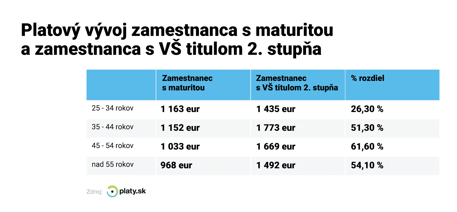 Kým V súčasnosti platí, že zamestnanec s maturitou dosahuje rýchly platový progres do 34 rokoch, pri zamestnancovi, ktorý má vysokoškolský titul 2. stupňa, je to v priemere až do 44 – 45 rokov. Neskôr už začínajú platovo skôr stagnovať.