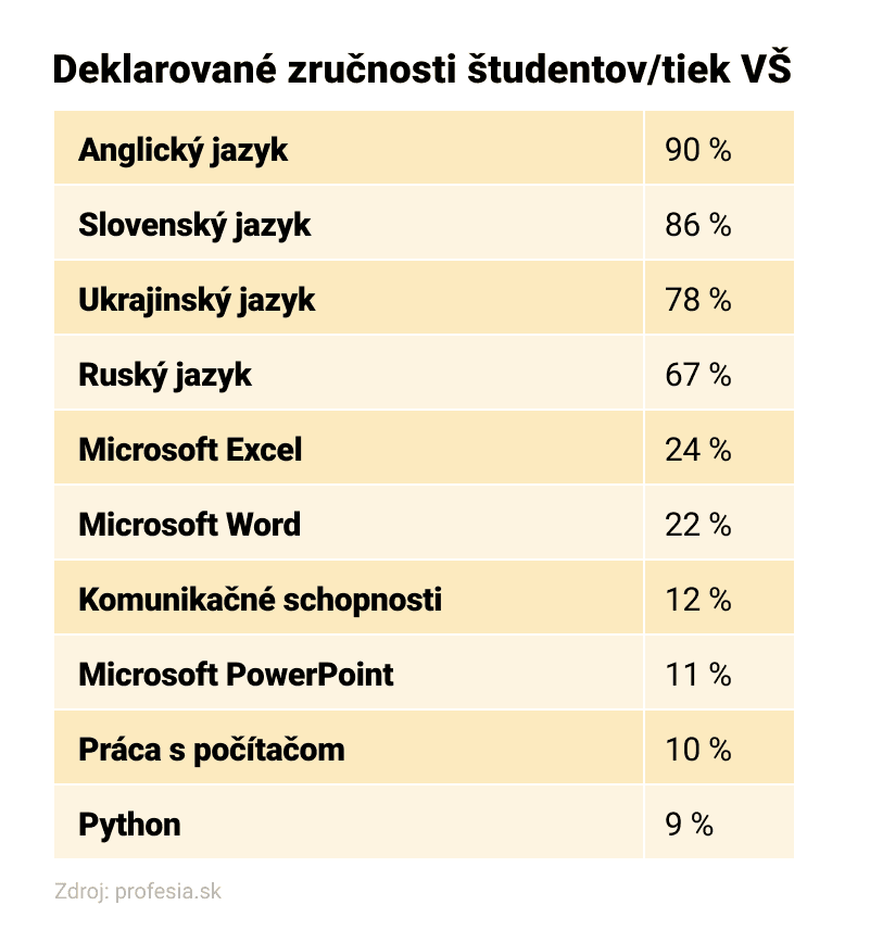 Študenti a študentky sú podľa dát z ich životopisov silní v jazykoch. Medzi zručnosťami, ktoré ovládajú, 90 percent uvádza anglický jazyk, 77 percent ukrajinský a 65 percent ruský. Najmä znalosť ukrajinčiny a ruštiny by mohli využiť vo svoj prospech, keďže v porovnaní s celoslovenskými dátami ich ovládajú nadpriemerne. Ak firmy hľadajú v databáze nových zamestnancov, ktorí ovládajú tieto dva jazyky, nájdu ich medzi študentmi na východe krajiny.