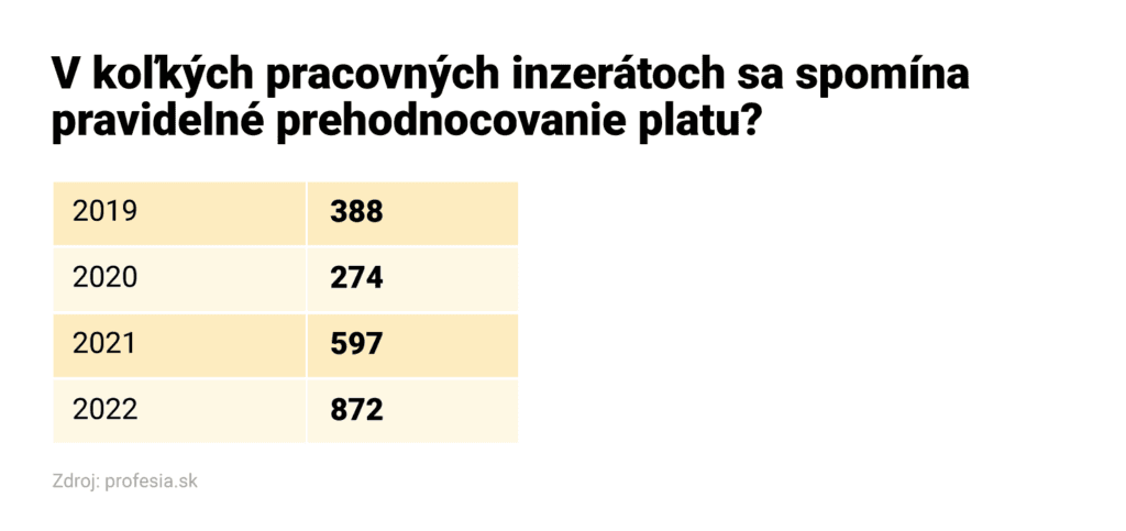 Kým v roku 2019 bola zmienka o pravidelnom prehodnocovaní platu iba v 388 ponukách práce, v aktuálnom roku išlo do polovice októbra o 872 pracovných inzerátov. Treba však zdôrazniť, že stále ide o veľmi málo rozšírenú vec. Podiel zo všetkých pracovných ponúk v tomto prípade nepredstavuje ani jedno percento.