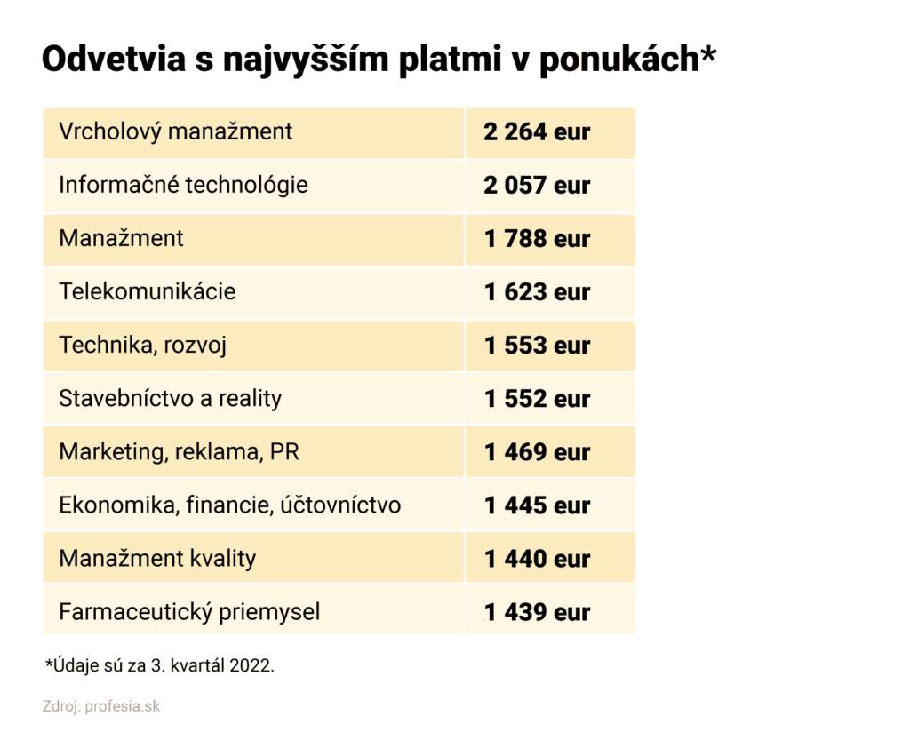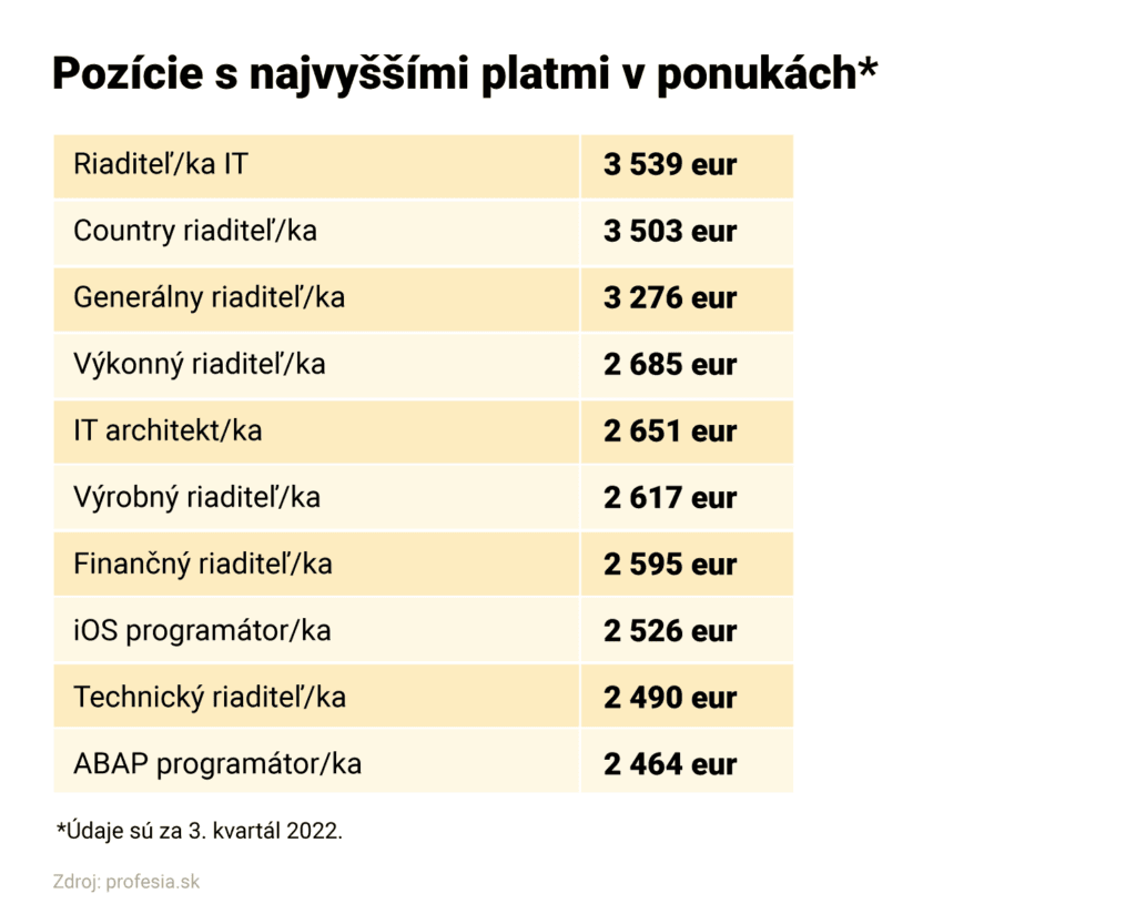 Štatistiky Profesie ukazujú, že spomedzi pozícií boli najvyššie platy v treťom štvrťroku 2022 v ponukách práce na riaditeľov a riaditeľky IT. V priemere išlo o 3 539 eur v hrubom.