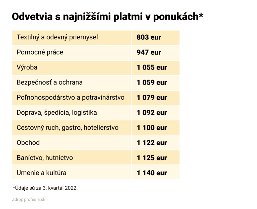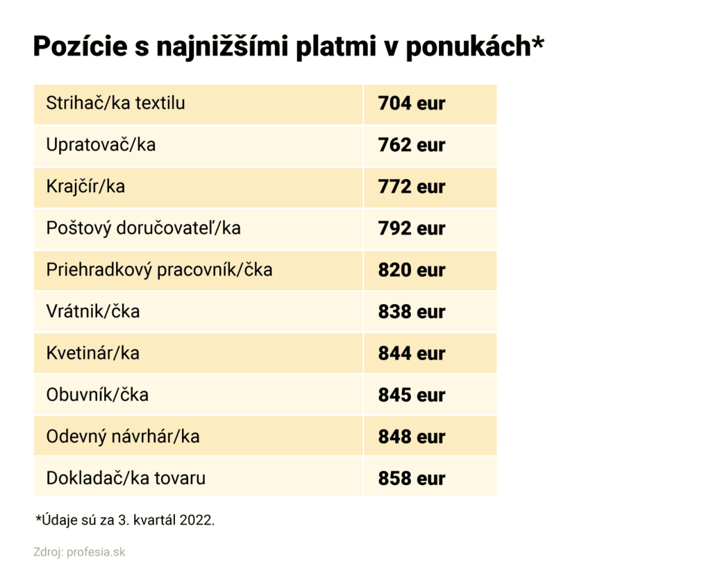 Spomedzi konkrétnych pozícií priniesol tretí kvartál 2022 najnižšie platy v pracovných ponukách na strihačov a strihačky textilu. Inzeráty práce na toto povolanie ponúkali priemernú základnú zložku mzdy 704 eur v hrubom.
