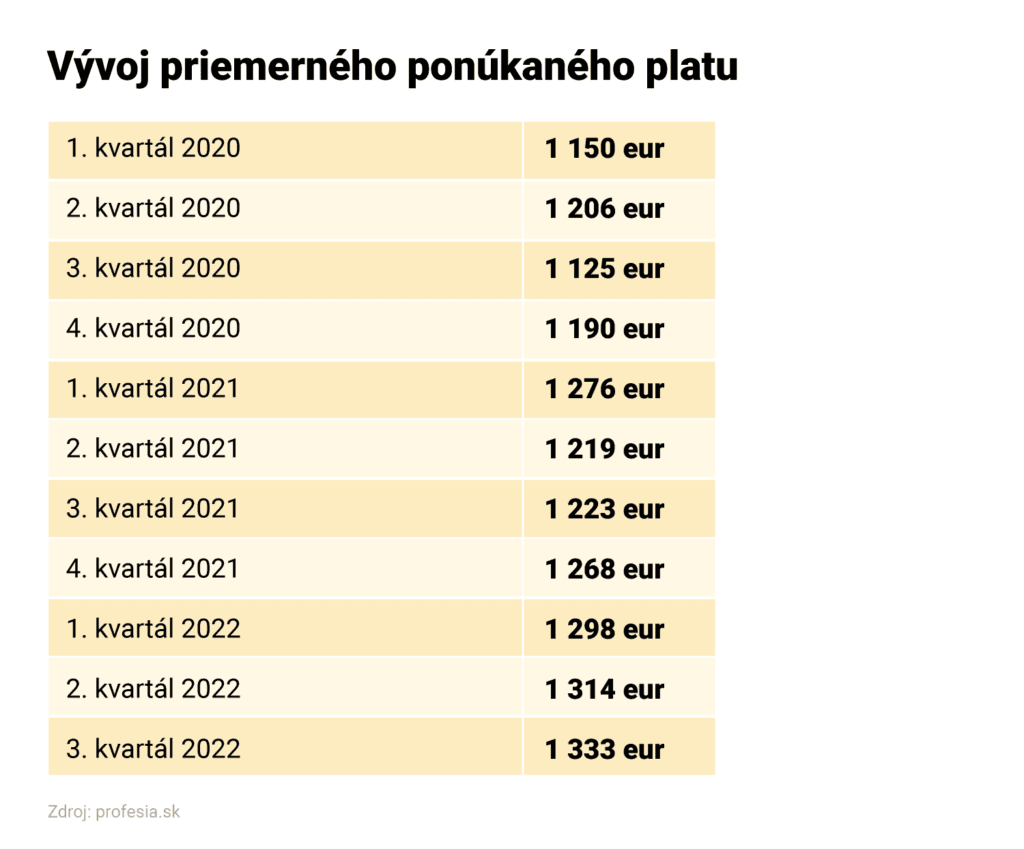 Zástupcovia firiem, ktorí uverejňovali ponuky na najväčšom pracovnom portáli na Slovensku v treťom kvartáli 2022, uvádzali priemernú základnú mzdu 1333 eur v hrubom. Oproti rovnakému obdobiu spred roka stúpla základná zložka mzdy o 110 eur. To predstavuje nárast o 9 percent.