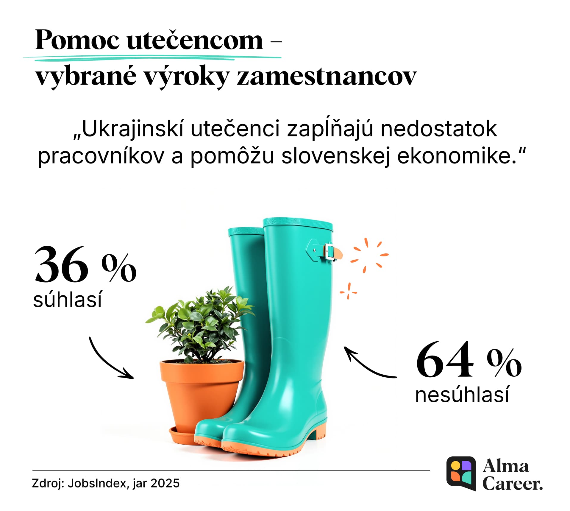 S ďalším z tvrdení v prieskume, že Ukrajinci pomáhajú zapĺňať nedostatok pracovníkov a pomáhajú ekonomike, súhlasí iba 36 %. Súčasne s výrokom, že ukrajinskí utečenci berú pracovné miesta slovenským občanom, súhlasí 44 % zamestnancov.