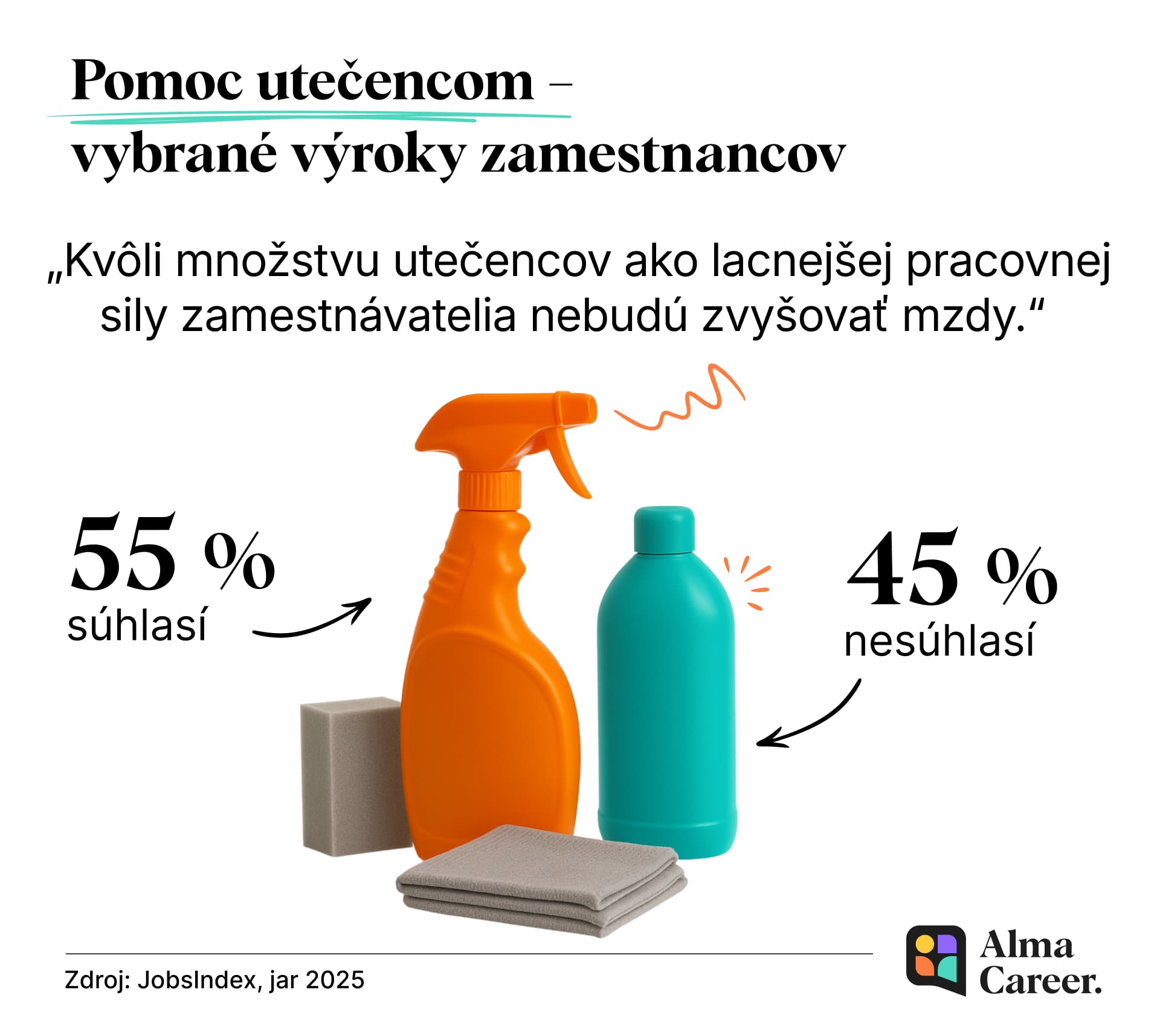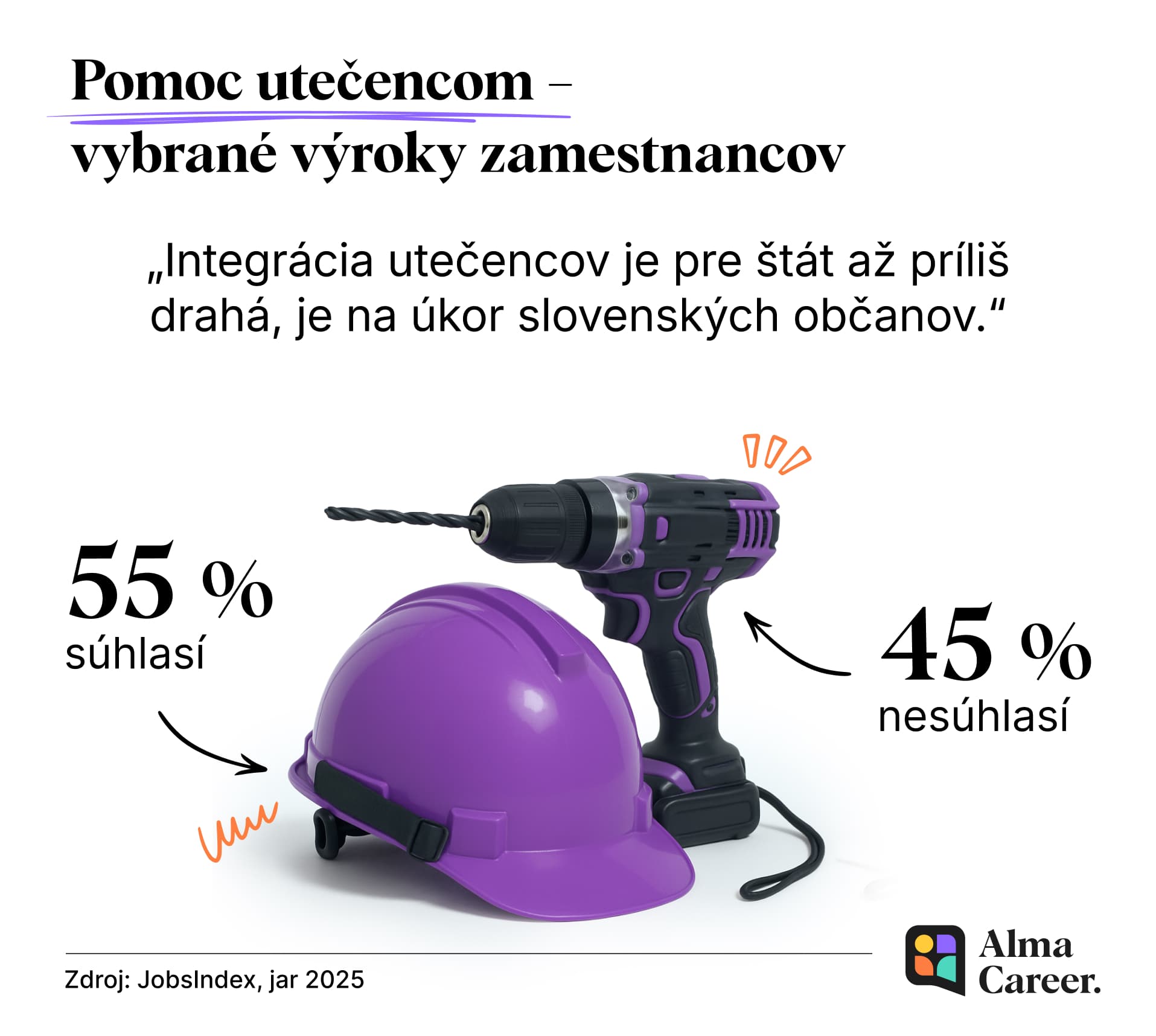 Najlepšie to ilustruje tvrdenie, že Integrácia utečencov je pre štát až príliš drahá a ide na úkor slovenských občanov. Súhlasí s ním až 55 % dopytovaných slovenských zamestnancov.