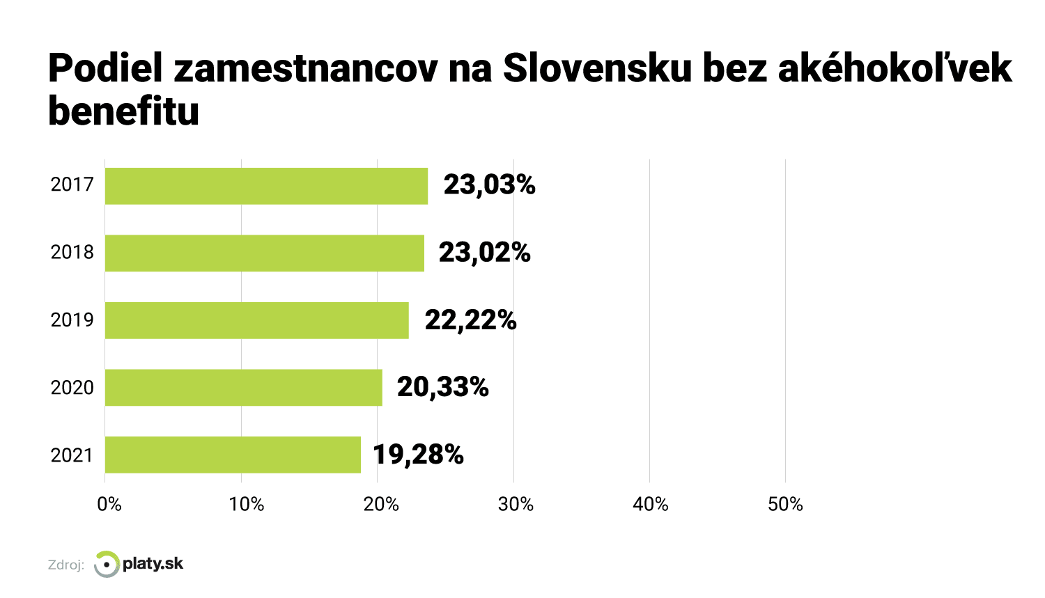 Najnovšia analýza mzdového porovnávača potvrdzuje, že pracovné prostredie sa na Slovensku neustále zlepšuje. Podiel zamestnancov, ktorí na svojom pracovisku nemajú k dispozícii žiaden benefit, sa stále znižuje.