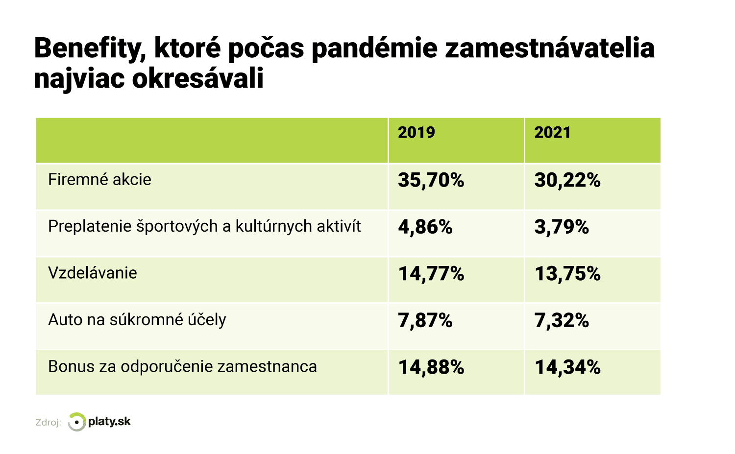 Zamestnávatelia oproti obdobiu spred pandémie okresávali tiež preplácanie športových a kultúrnych aktivít, vzdelávanie či firemné automobily.