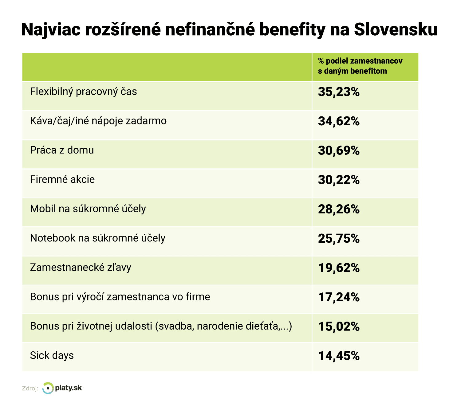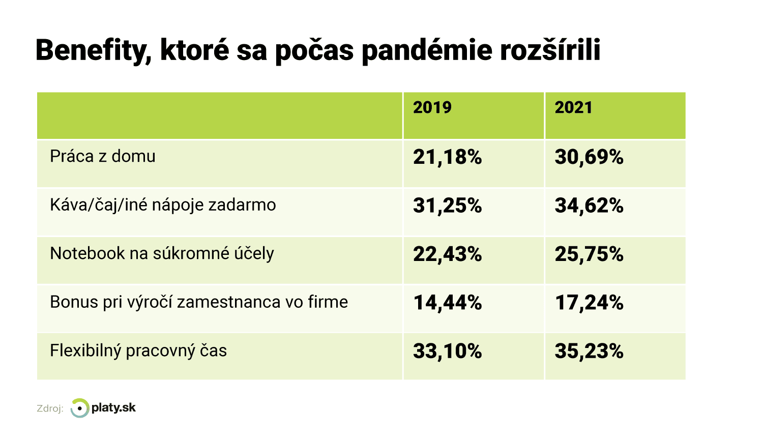 Počas posledných dvoch rokov sa medzi zamestnancami rozšírila tiež káva či čaj zadarmo, notebook, bonus pri výročí zamestnancov vo firme či flexibilný pracovný čas.