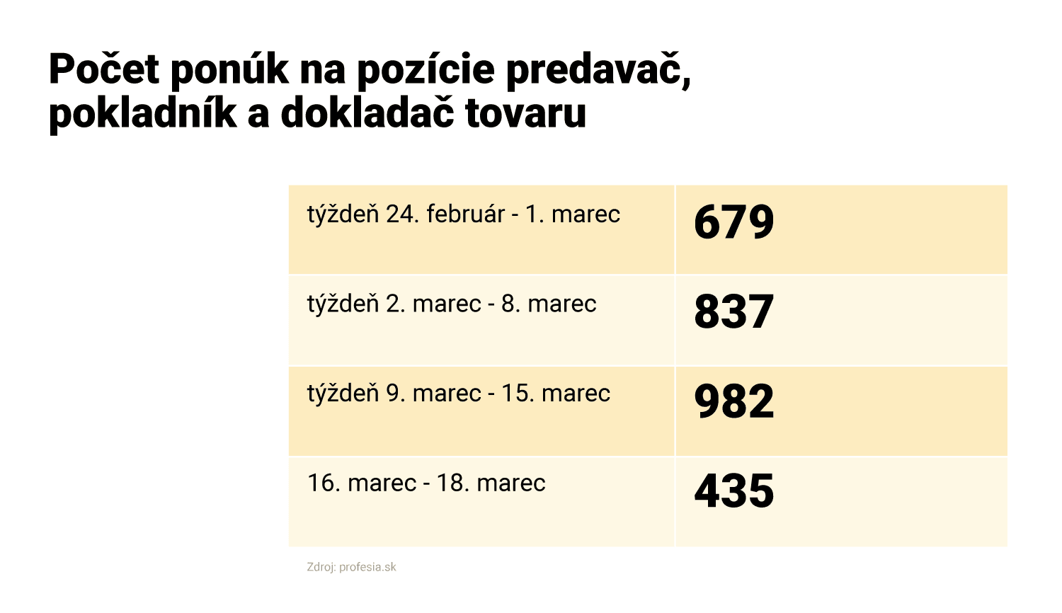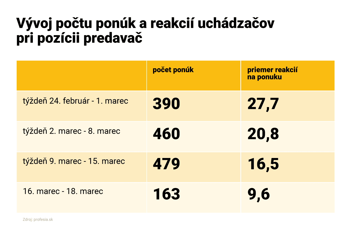 Kým v týždni od 24. februára do 1. marca bolo uverejnených 679 pracovných ponúk na tieto tri pozície, minulý týždeň už išlo o takmer tisíc nových inzerátov. Trend pritom pretrváva aj v tomto týždni, keď portál od pondelka 16. do stredy 18. marca evidoval 435 nových inzerátov na tieto pozície.