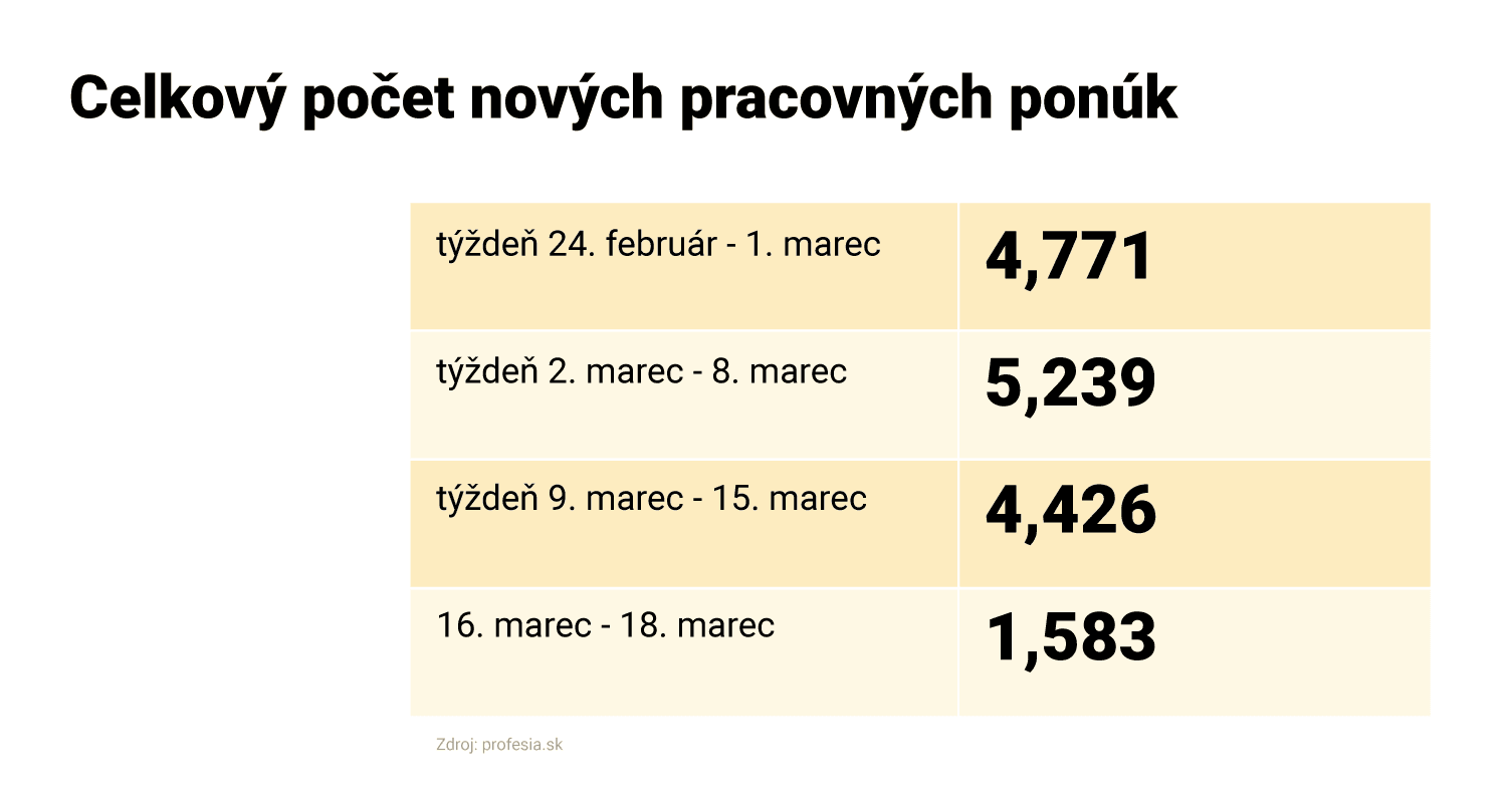 Zamestnávatelia pritom pridávajú nové ponuky práce aj tento týždeň. Od pondelka 16. marca do stredy 18. marca bolo pridaných takmer 1600 nových pracovných inzerátov.