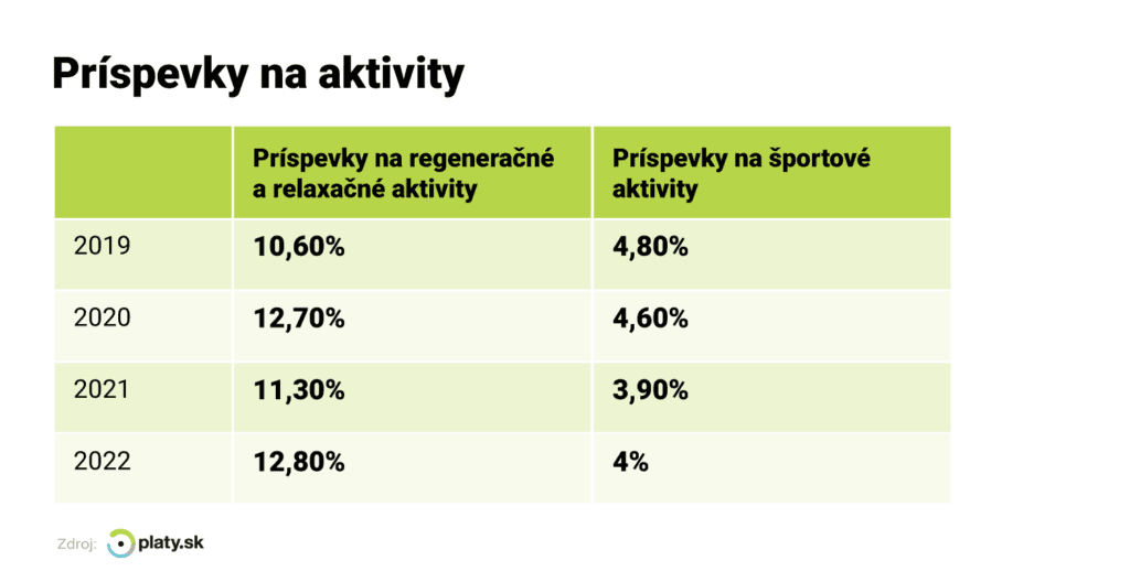 Príspevok na regeneračné aktivity, ako je napríklad wellness či masáže, malo v roku 2020 k dispozícii 12,7 percenta ľudí. O rok neskôr sa tento podiel o čosi znížil. Portál Platy.sk však ukazuje, že v tomto prípade išlo o krátkodobú záležitosť a v roku 2022 sa podiel zamestnancov s týmto benefitom opäť zvýšil.