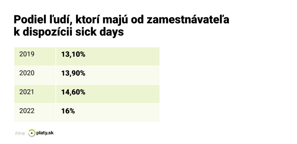 Spomedzi „zdravých“ benefitov, ktoré sleduje portál Platy.sk, sú na Slovensku najrozšírenejšie sick days. Ide o voľno nad rámec zákona, ktoré môžu ľudia čerpať, keď sa necítia dobre.