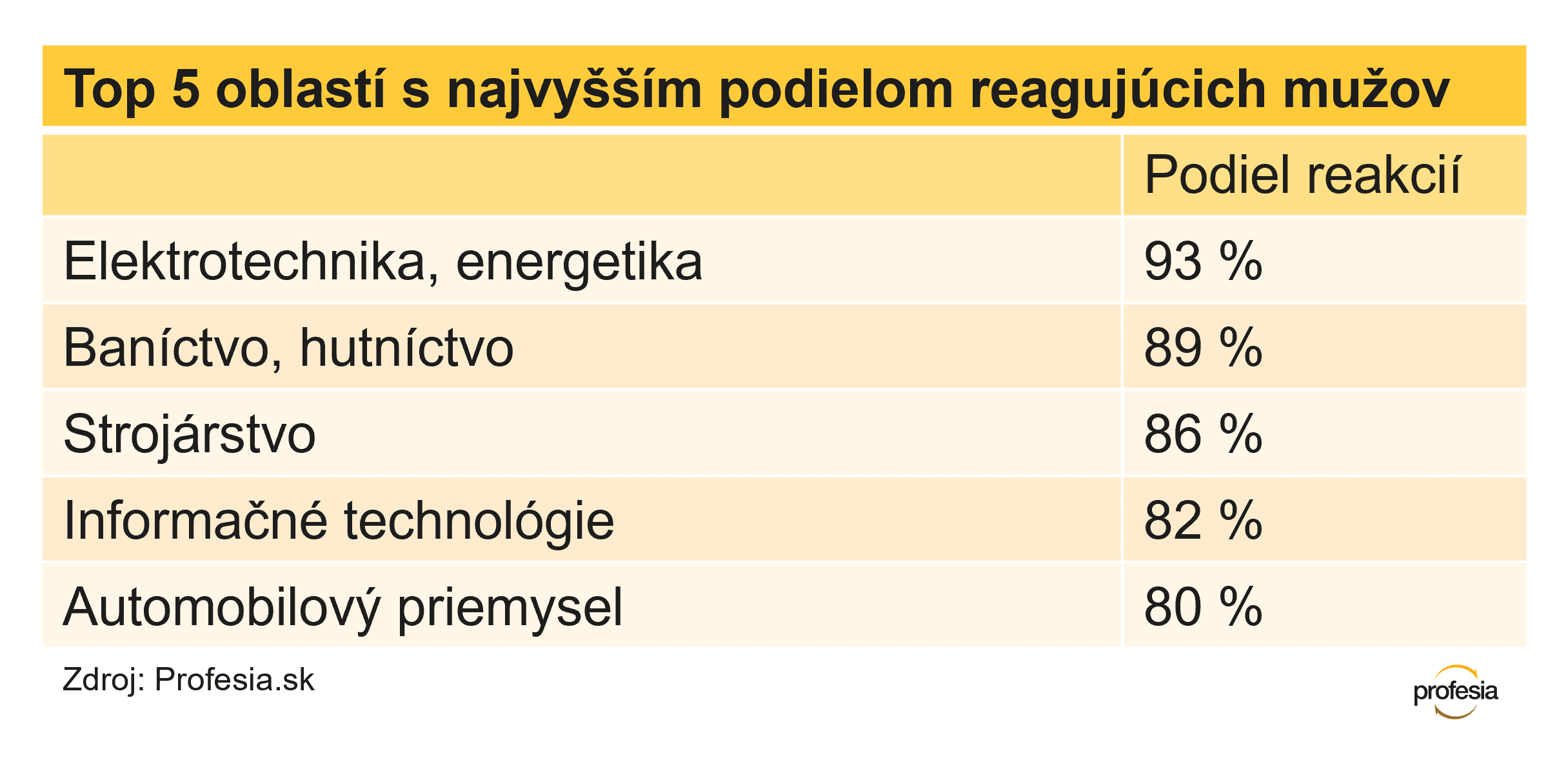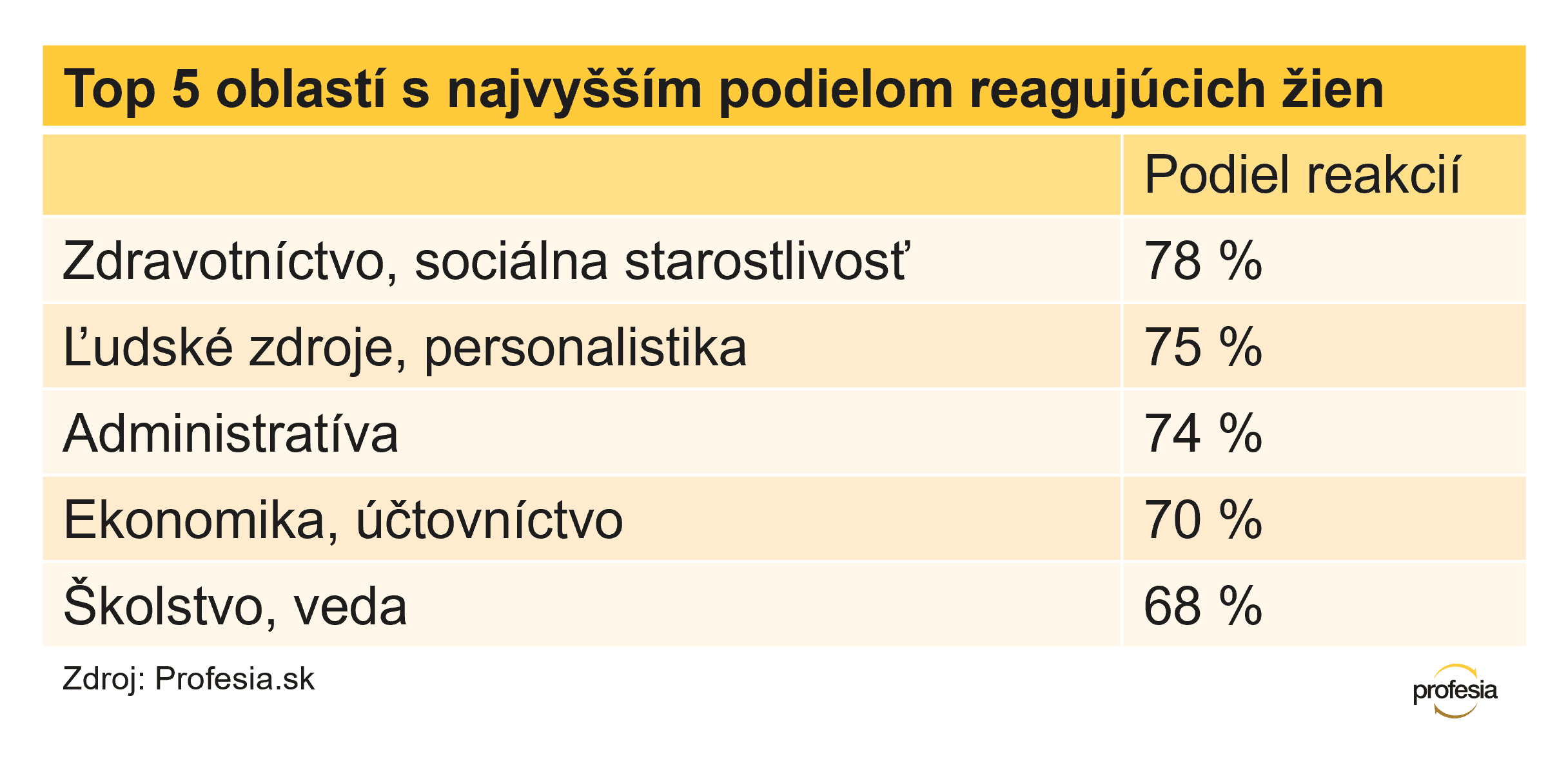 V reakciách na pracovné ponuky na portáli Profesia.sk ženy suverénne dominujú v záujme o zdravotníctvo a sociálnu starostlivosť, personalistiku, administratívu, ekonomiku a školstvo. Naopak, výrazne väčší podiel mužov ako žien reaguje na inzeráty z elektrotechniky a energetiky, baníctva, strojárstva, informačných technológií a z automobilového priemyslu.