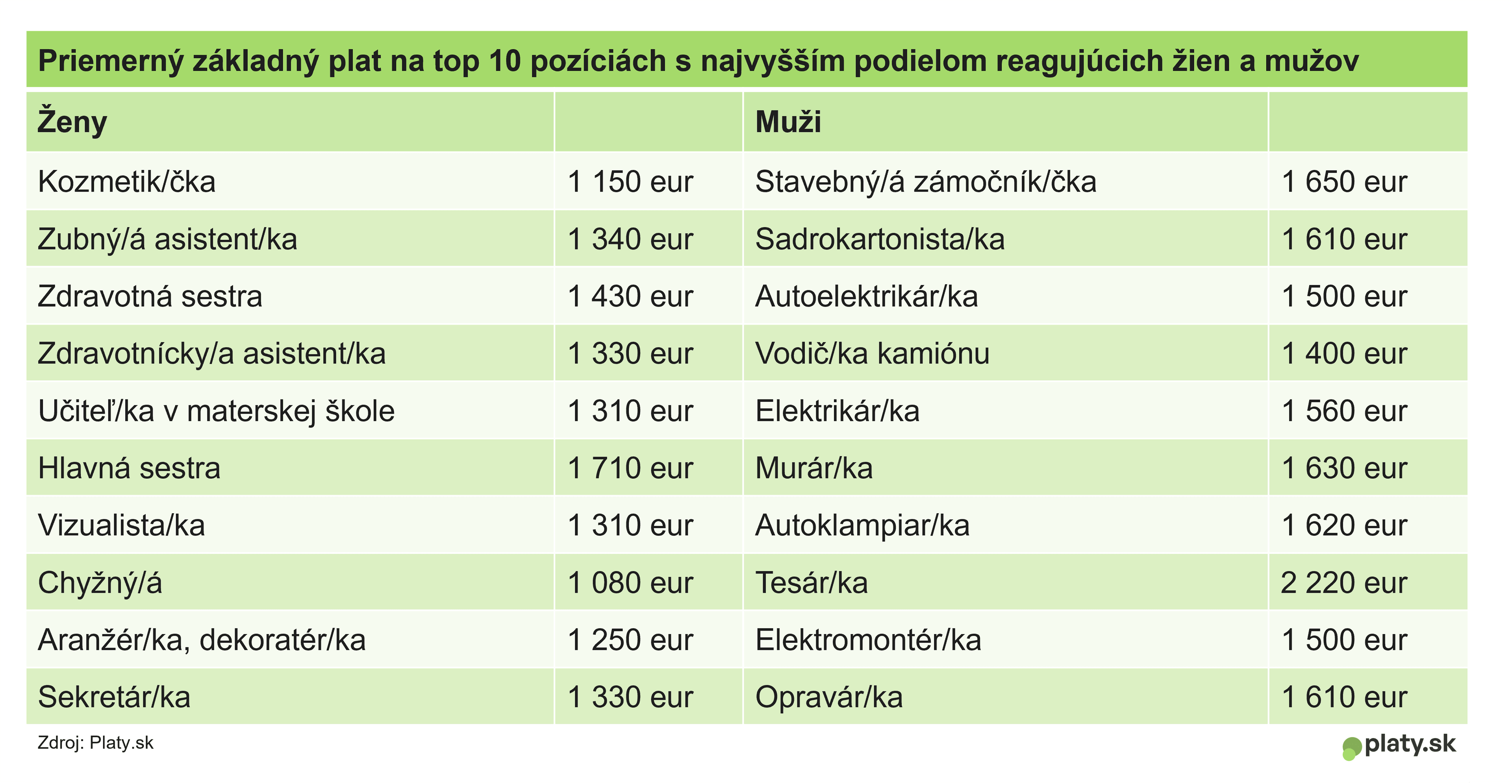 Pohľad na mzdy na daných pozíciách hovorí jasne v prospech tých, ktoré preferujú muži. Z dát portálu Platy.sk vyplýva, že spomedzi 10 pozícií, pri ktorých v záujme jasne dominujú ženy, iba jedna prekročila priemerný základný mesačný plat 1 500 eur v hrubom. V mužskej top 10 iba jedna pozícia túto métu nedosiahla.
