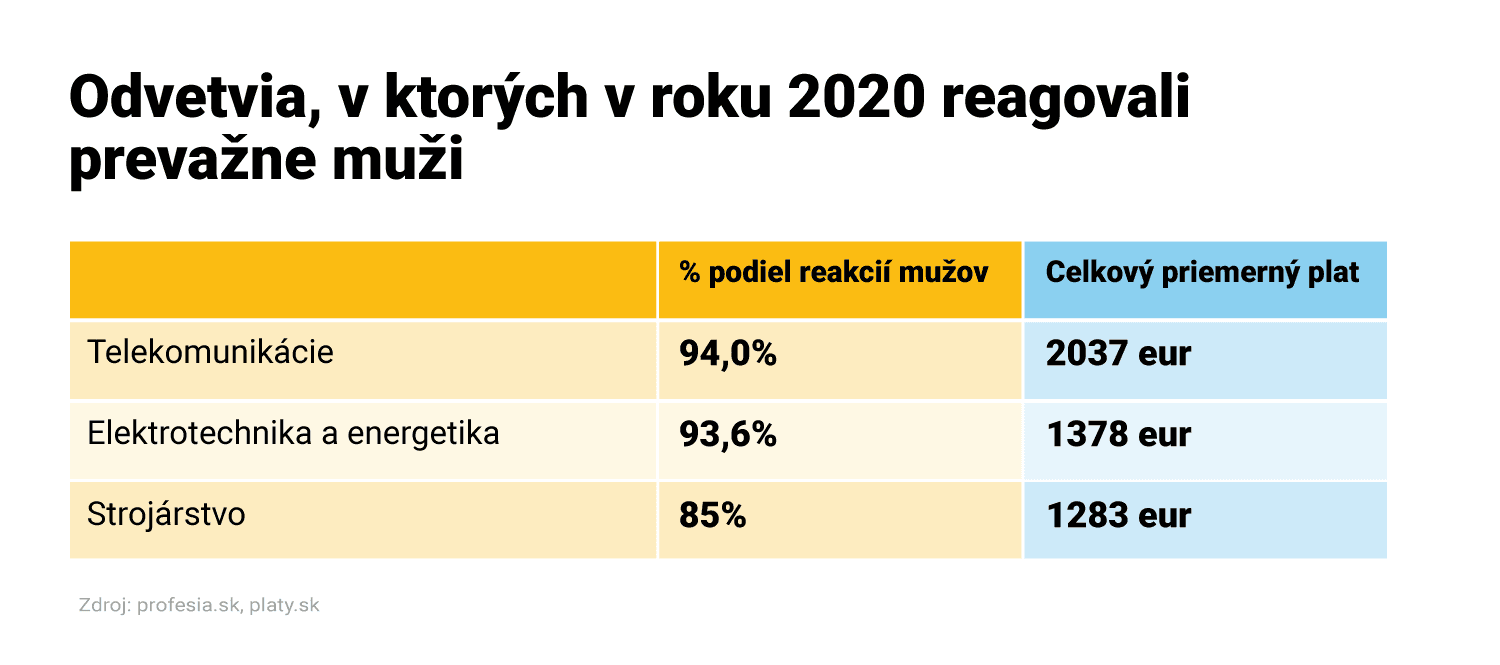 Naopak, keď sa pozrieme, v ktorých odvetviach vidíme na portáli Profesia.sk reakcie od mužov, dominujú telekomunikácie, elektrotechnika a energetika a strojárstvo.