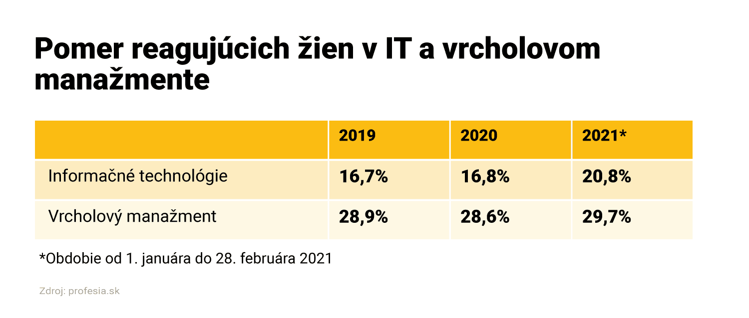 Prvé dva mesiace roka 2021 však priniesli jemný nárast v záujme uchádzačiek o informačné technológie. Kým v roku 2020 tvorili ženy spomedzi kandidátov o IT pozície iba 16,8 percenta, počas januára a februára tento podiel stúpol o štyri percentá.
