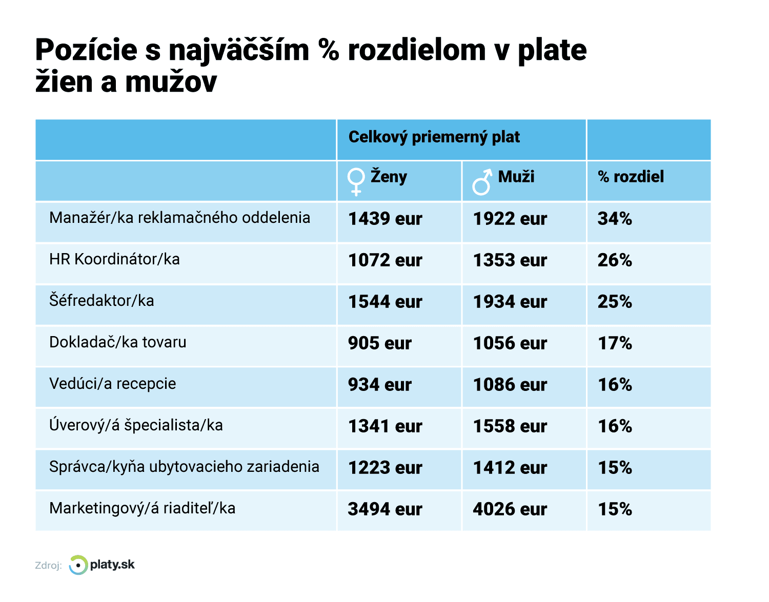Dáta portálu Platy.sk potvrdzujú, že medzi ženami a mužmi sú na Slovensku mzdové rozdiely aj na rovnakých pozíciách. V roku 2020 zarábali manažérky reklamačného oddelenia v priemere 1439 eur v hrubom. Muži na tejto pozícii zarobili oproti ženám o vyše tretinu viac.