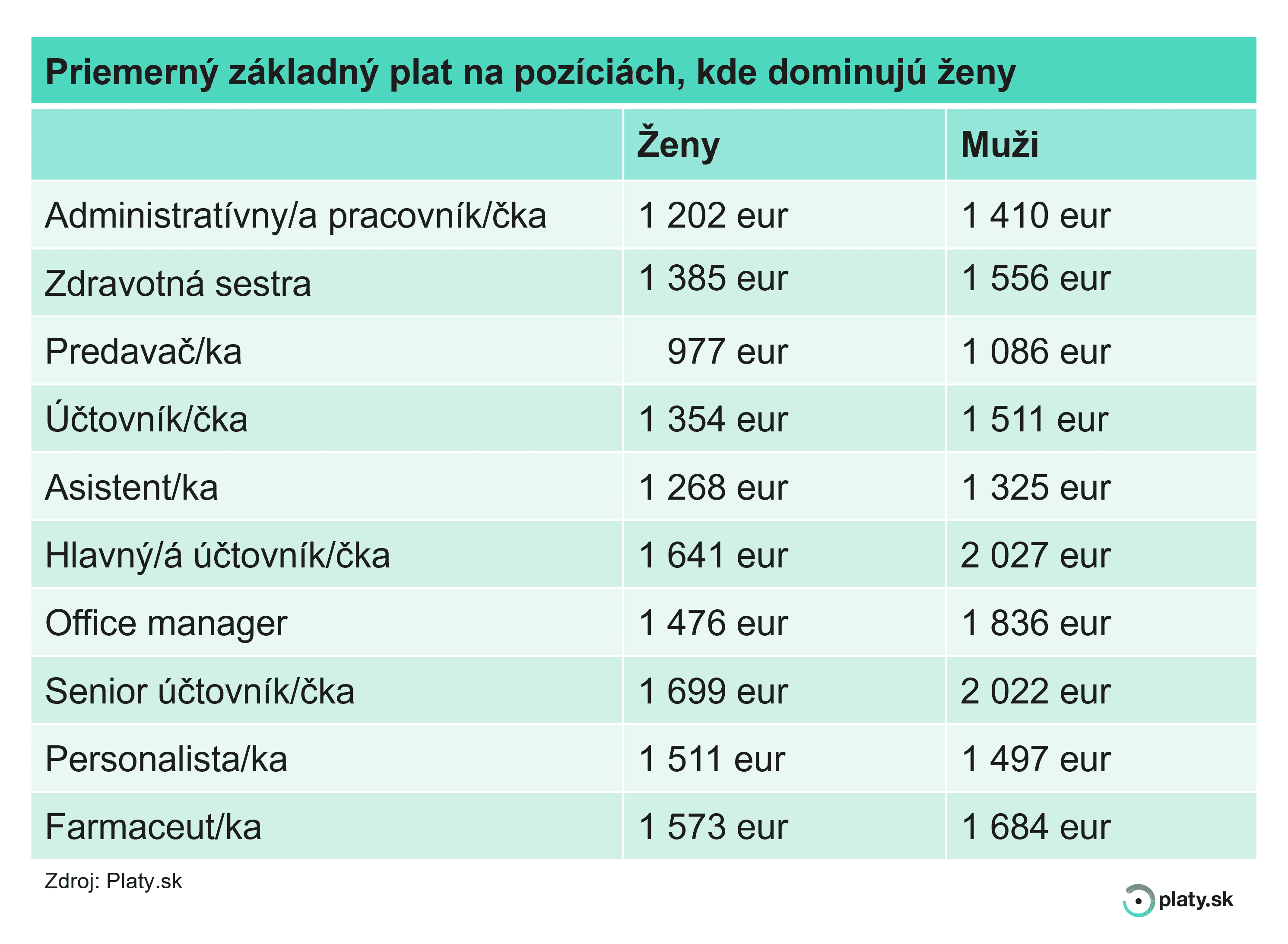 Z dát portálu Platy.sk vyplýva, že ženy oveľa častejšie ako muži pracujú ako administratívne pracovníčky, zdravotné sestry, predavačky, účtovníčky, asistentky, office manažérky či farmaceutky. Aj na týchto pozíciách však v priemere zarábajú menej ako ich mužskí kolegovia.