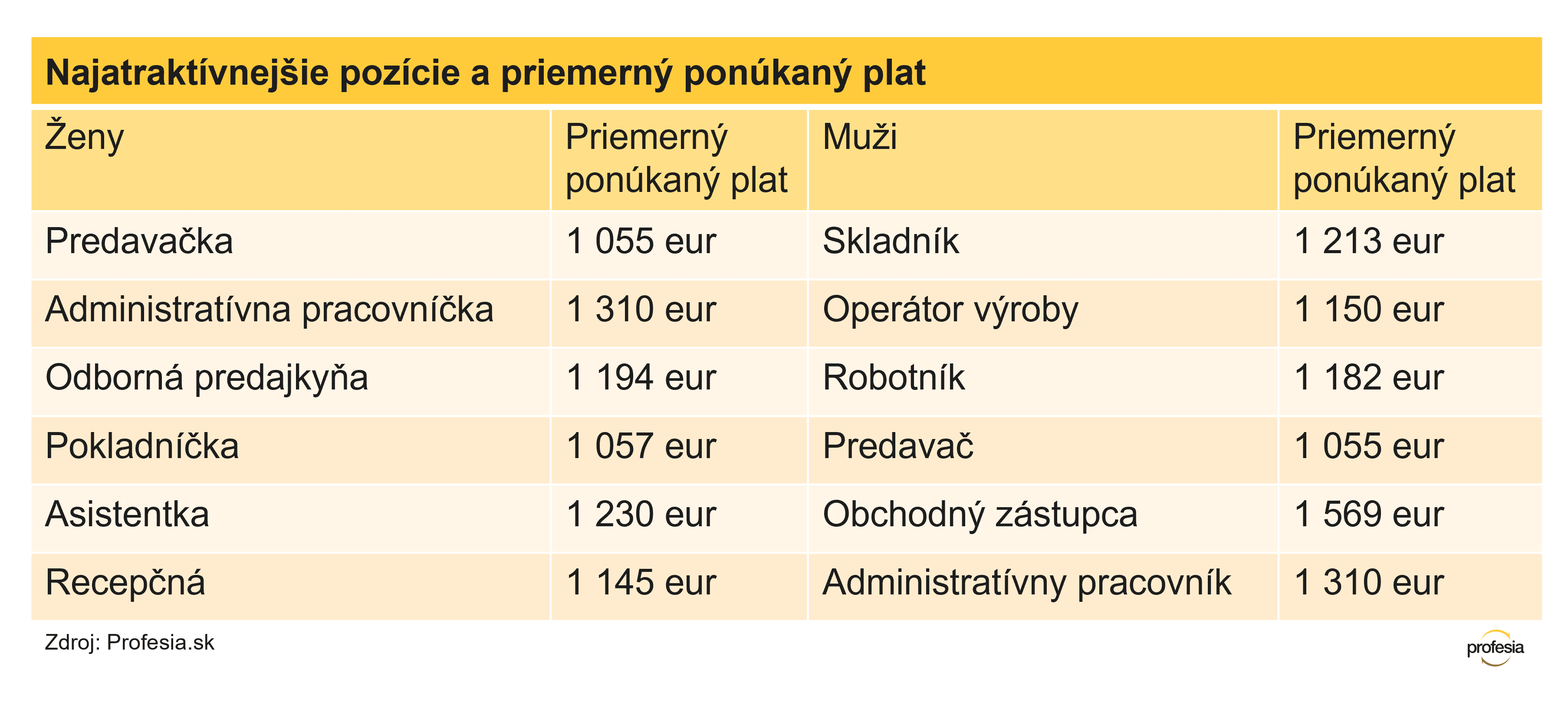 Medzi profesiami, na ktorých dominujú ženy, sú aj také, pri ktorých je priemerný mesačný plat mužov a žien rovnaký či veľmi podobný. Personalistky zarábajú v priemere 1 511 eur mesačne, personalisti 1 497 eur. Okolo 1 110 eur zarábajú rovnako recepčné aj recepční.
