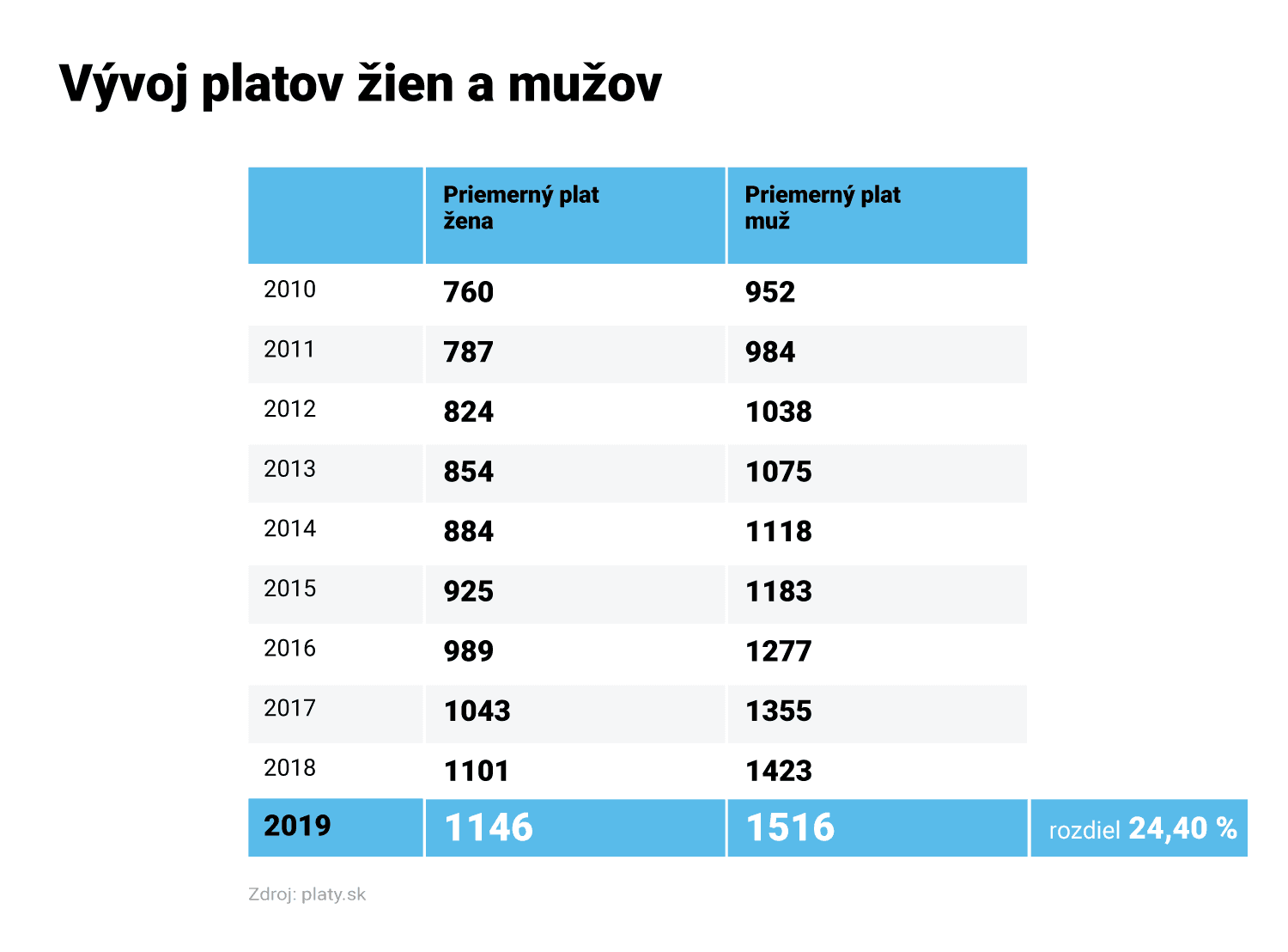 Kým celková priemerná mzda žien v roku 2019 predstavovala 1146 eur, plat u mužov bol o pár stoviek vyšší. Na ich priemernej výplatnej páske svietila suma 1516 eur v hrubom.