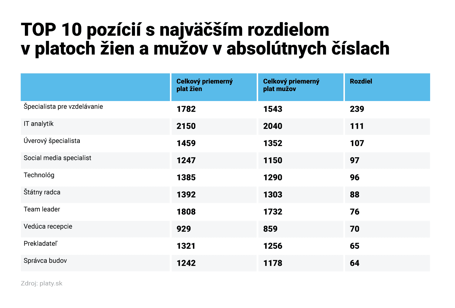 Môžeme vidieť, že drvivá väčšina z desiatich pozícií, pri ktorých portál Platy.sk eviduje najväčšie rozdiely medzi platmi žien a mužov, sú odborné špecializované povolania.