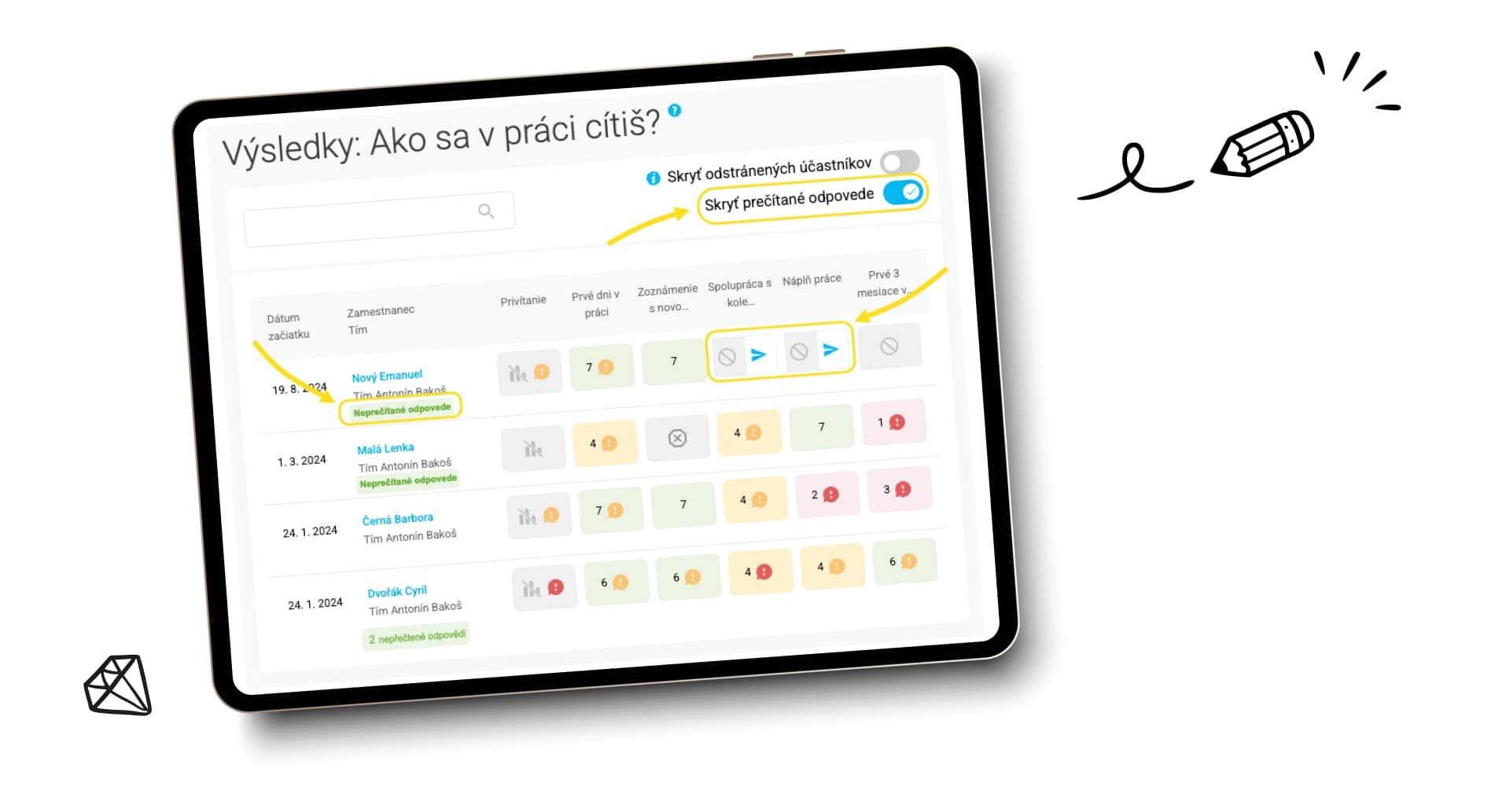 Digitálny parťák Arnold všetky neprečítané odpovede zvýrazní a tiež vám ich umožní jednoducho vyfiltrovať. Príslušný manažér tak okamžite vidí najčerstvejšie výsledky spustených prieskumov a môže na ne včas reagovať. A má stále dokonalý prehľad o nálade vo firme. Či už ide o fungovanie tímu pod novým lídrom, alebo napríklad problémy pri onboardingu.