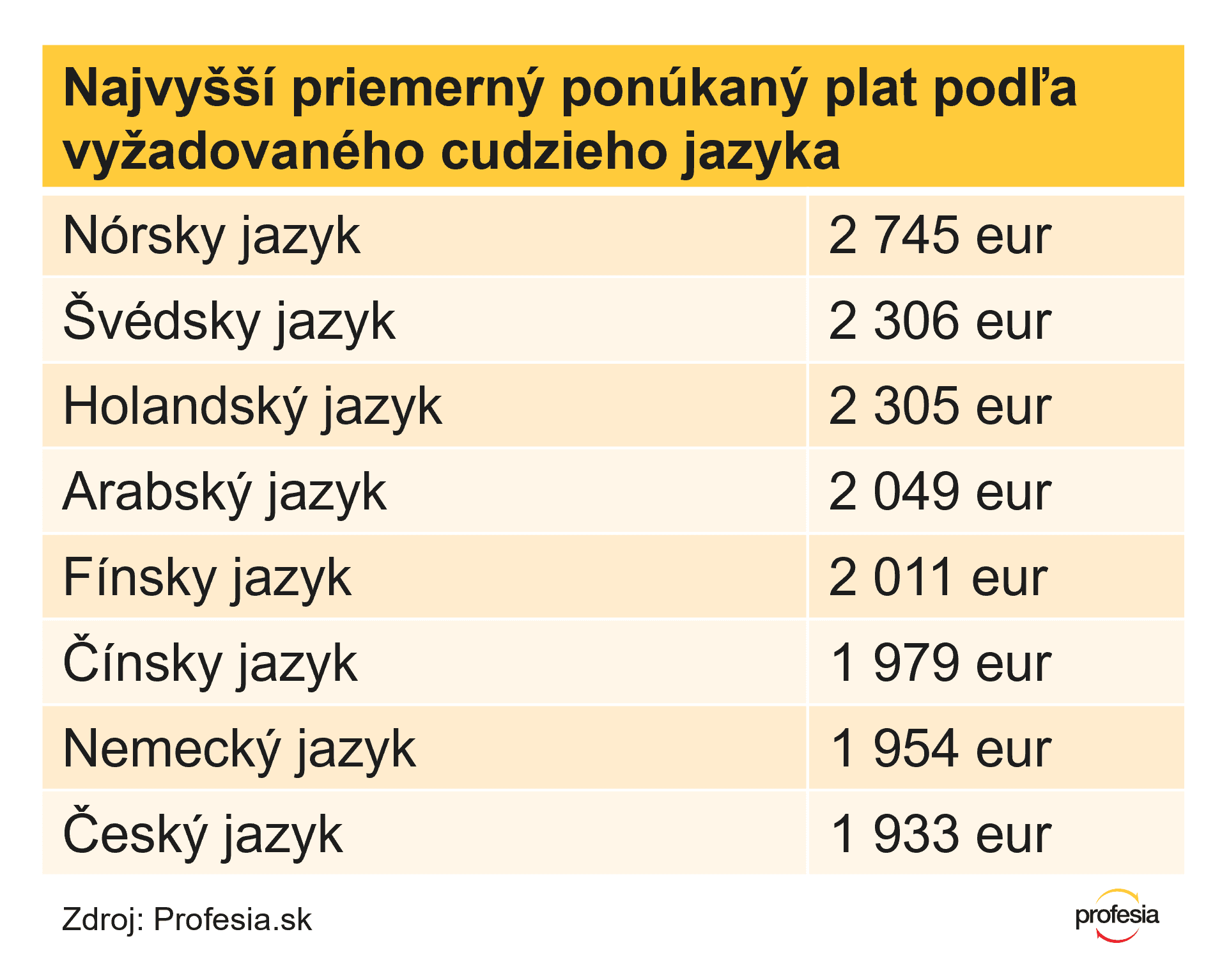 Motivácia učiť sa cudzie jazyky môže byť aj finančná. Zatiaľ čo priemerný ponúkaný plat zo všetkých inzerátov na portáli Profesia.sk je tento rok 1 576 eur, inzeráty, ktoré uvádzali potrebu znalosti cudzieho jazyka, ponúkali v priemere o 300 eur viac. Ponúkané platy v inzerátoch, v ktorých zamestnávatelia požadovali znalosť jazykov severských krajín, dokonca výrazne prekračujú 2 000 eur mesačne. Inzeráty s nórskym jazykom ponúkali v priemere 2 700 eur, so švédskym 2 300 eur. Rovnaký priemerný plat bol napríklad aj v ponukách, ktoré vyžadovali holandčinu.