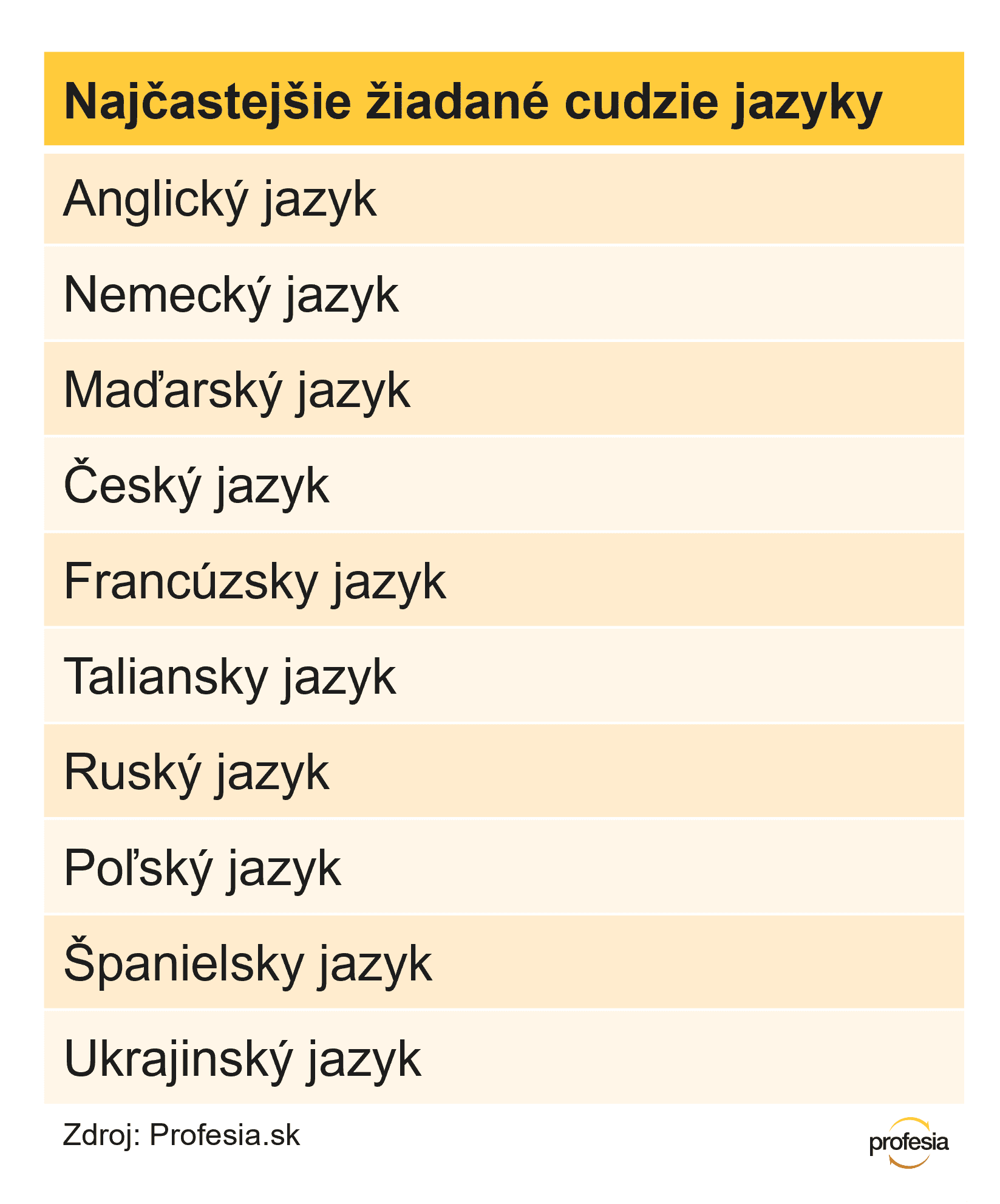 Zamestnávatelia v pracovných ponukách na portáli Profesia.sk spomedzi cudzích jazykov najčastejšie vyžadujú ovládanie angličtiny. Je to druhá najžiadanejšia zručnosť. Uvádzalo ju 35 percent ponúk, čo predstavuje 62-tisíc inzerátov. K najčastejšie žiadaným jazykom patrí aj nemčina, maďarčina a čeština.